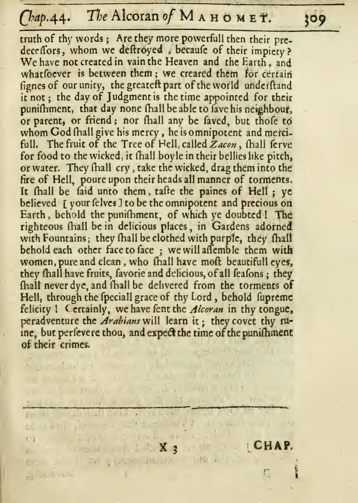 truth of thy words; Are they more powerfull then their predecessors, whom we destroyed, because of their impiety? We have not created in vain the Heaven and the Earth, and whatsoever is between them; we created them for certain signes of our unity, the greatest part of the world understand it not; the day of Judgment is the time appointed for their punishment, that day none shall be able to save his neighbour, or parent, or friend; nor shall any be saved, but those to whom God shall give his mercy, he is omnipotent and mercifull. The fruit of the Tree of Hell, called Zacon, shall serve for food to the wicked, it shall boyle in their bellies like pitch, or water. They shall cry, take the wicked, drag them into the fire of Hell poureupon their heads all manner of torments. It shall be said unto them, taste the paines of Hell; ye believed [your selves] to be the omnipotent and precious on Earth, behold the punishment of which ye doubted! The righteous shall be in delicious places, in Gardens adorned with Fountains, they shall be clothed with purple they shall behold each other face to face; we will assemble them with women, pure and clean who shall have most beautiful eyes, they shall have fruits, savorie and delicious, of all seasons; they shall never dye, and shall be delivered from the torments of Hell, through the special grace of thy Lord; behold supreme felicity! Certainly we have sent the Alcoran in thy tongue, peradventure the Arabians will learn it; they covet thy ruine, but persevere thou, and expect the time of the punishment of their crimes.