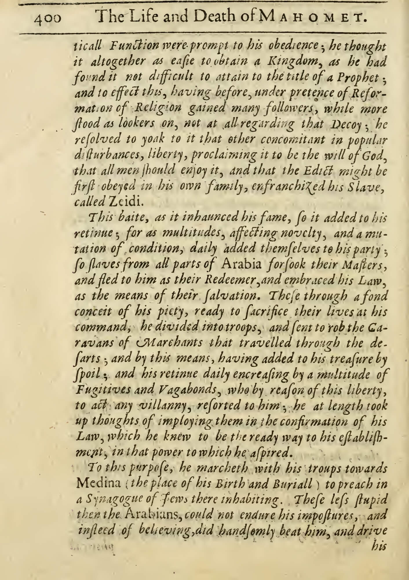 This baite, as it inhaunced his fame, so it added to his retinue; for as multitudes, affecting novelty, and a mutation of condition, daily added themselves to his party; so slaves from all parts of Arabia forsook their Masters, and fled to him as their Redeemer, and embraced his Law, as the means of their Salvation. These though a gound conceit of his piety, ready to sacrifice their lives at his command, he divided into troops, and sent to rob the Caravans of Marchants that travelled through the desarts; and by this means, having added to his treasure by spoil; and his retinue daily increasing by a multitude of Fugitives and Vagabonds, who by reason to this liberty, to act any villanny, resorted to him; he at length took up thoughts of imploying them in the confirmation of his Law, which he knew to be the ready way to his establishment, in that power to which he aspired.