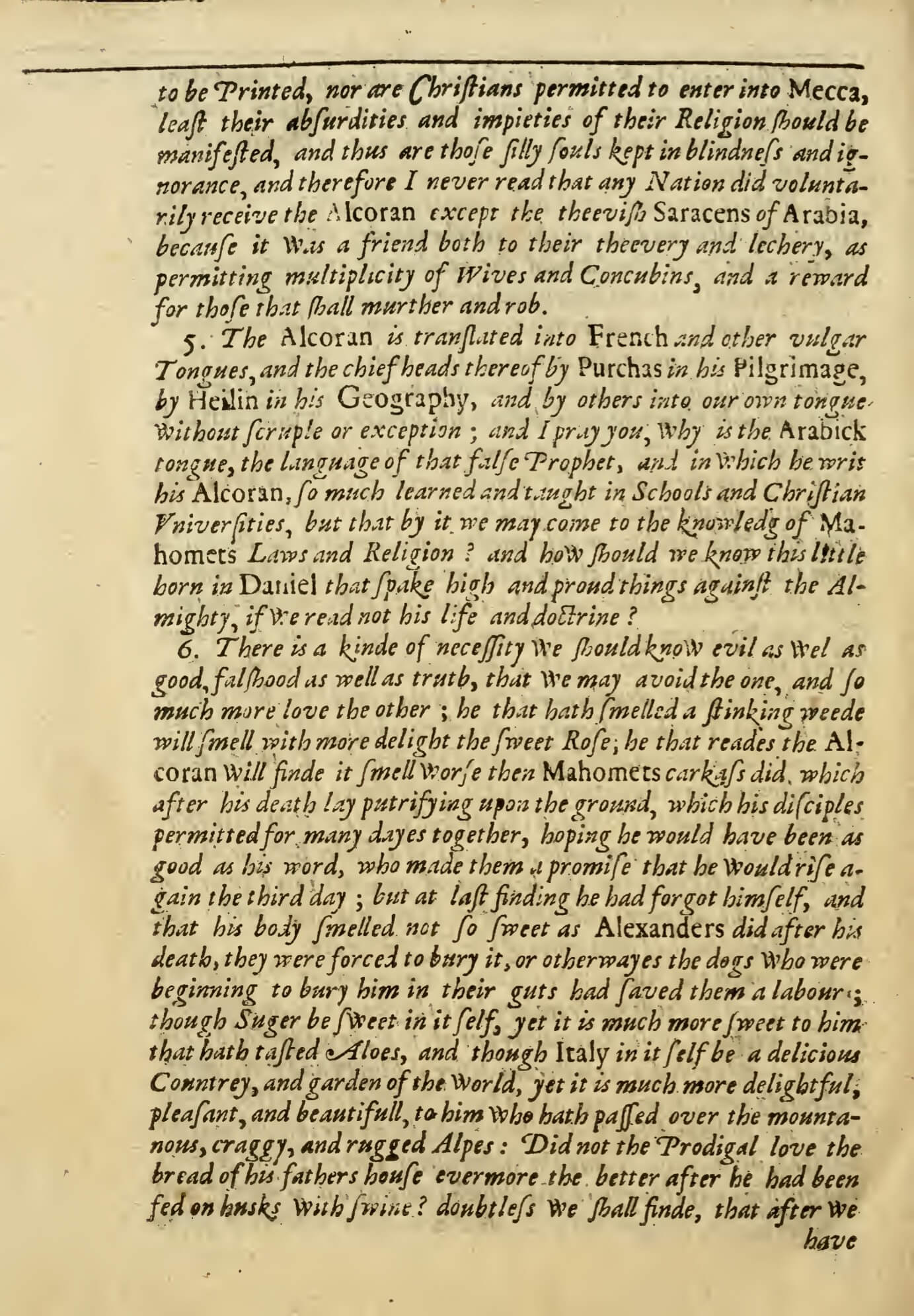 5. The Alcoran is translated into French and other vulgar Tongues, and the chief heads thereof by Purchas in his Pilgrimage, by Heilin in his Geography, and by others into our own tongue without scruple or exception; and I pray you, why is the Arabick tongue, the language of that false Prophet, and in which he writ his Alcoran, so much learned and taught in Schools and hristian Universities, but that by it we may come to the knowledg of Mahomets Laws and Religion? and how should we know this little born in Daniel that spake high and proud things against the Almighty, if we read not his life and doctrine?