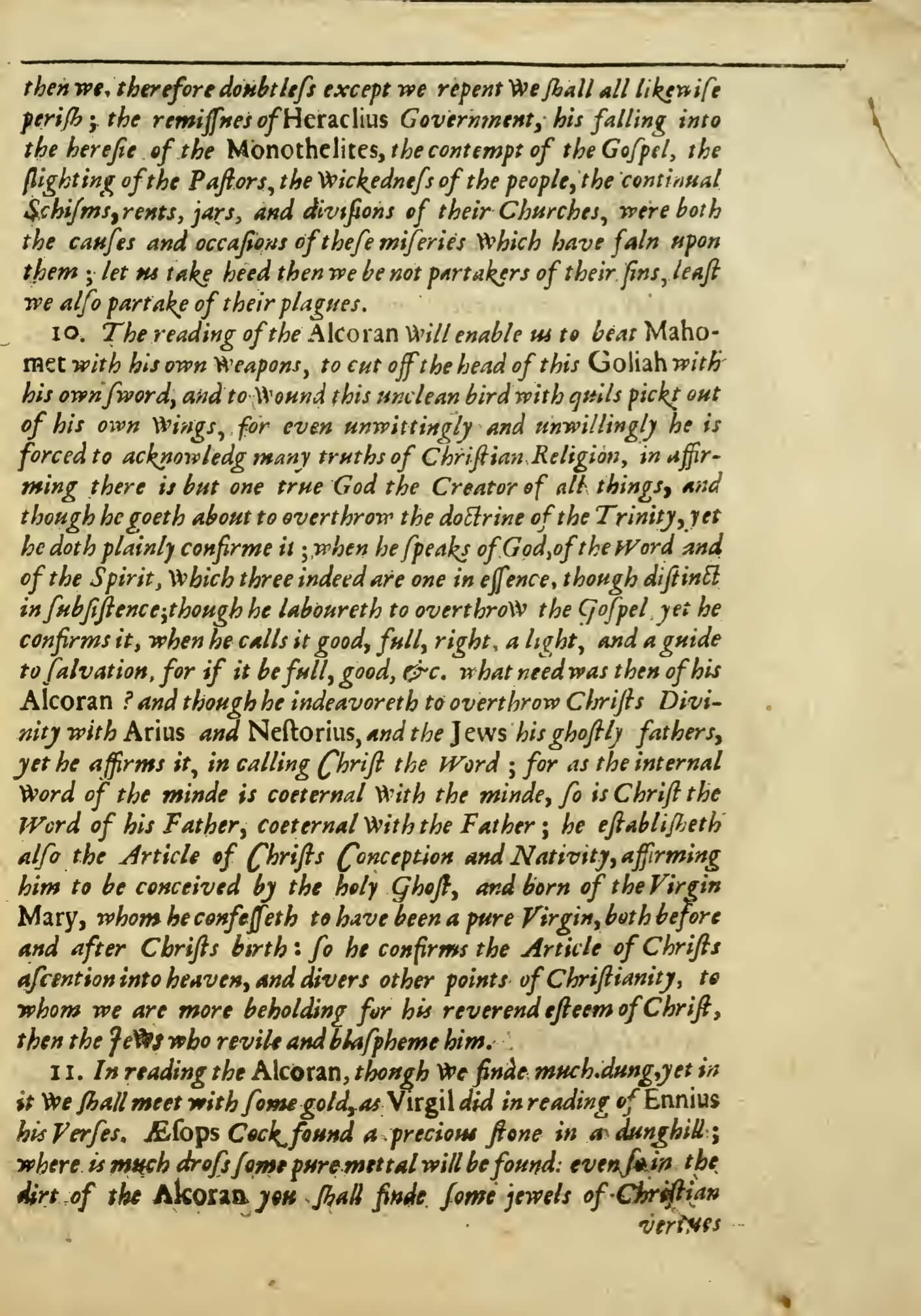 11. In reading the Alcoran, though we finde much dung, yet in it we shall meet with some gold, as Virgil did in reading of Ennios his Verses. Æsops Cock found a precious stone in a dunghill; where is much dross some pure metal will be found: even so in the dirt of the Alcoran you shall finde some jewels of Christians vertues