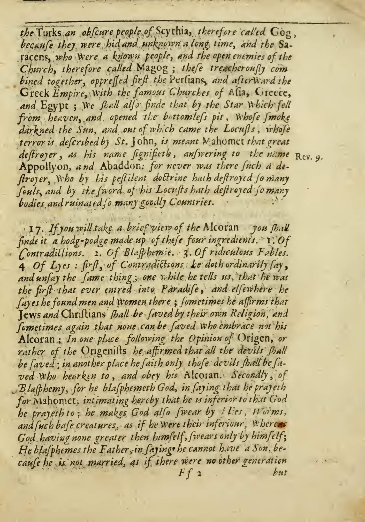 the Turks an obscure people of Scythia, therefore called Gog, because they were hid and unknown a long time, and the Saracens, who where a known people, and the open enemies of the Church, therefor called Magog; these treacherously combined together, oppressed first the Persians, and afterward the Greek Empire, with the famous Churches of Asia, Greece, and Egypt; We shall also finde that by the Star which fell from heaven, and opened the bottomless pit, whose smoke darkened the Sun, and out of which came the Locusts, whose terror is described by St. John, is meant Mahomet that great destroyer, as his name signifieth, answering to the name Appollyon, and Abaddon: for never was there such a destroyer, who by hus pestilent doctrine hath destroyed so many souls, and by the sword of his Locusts hath destroyed so many bodies and ruinated so many goodly Countries.
