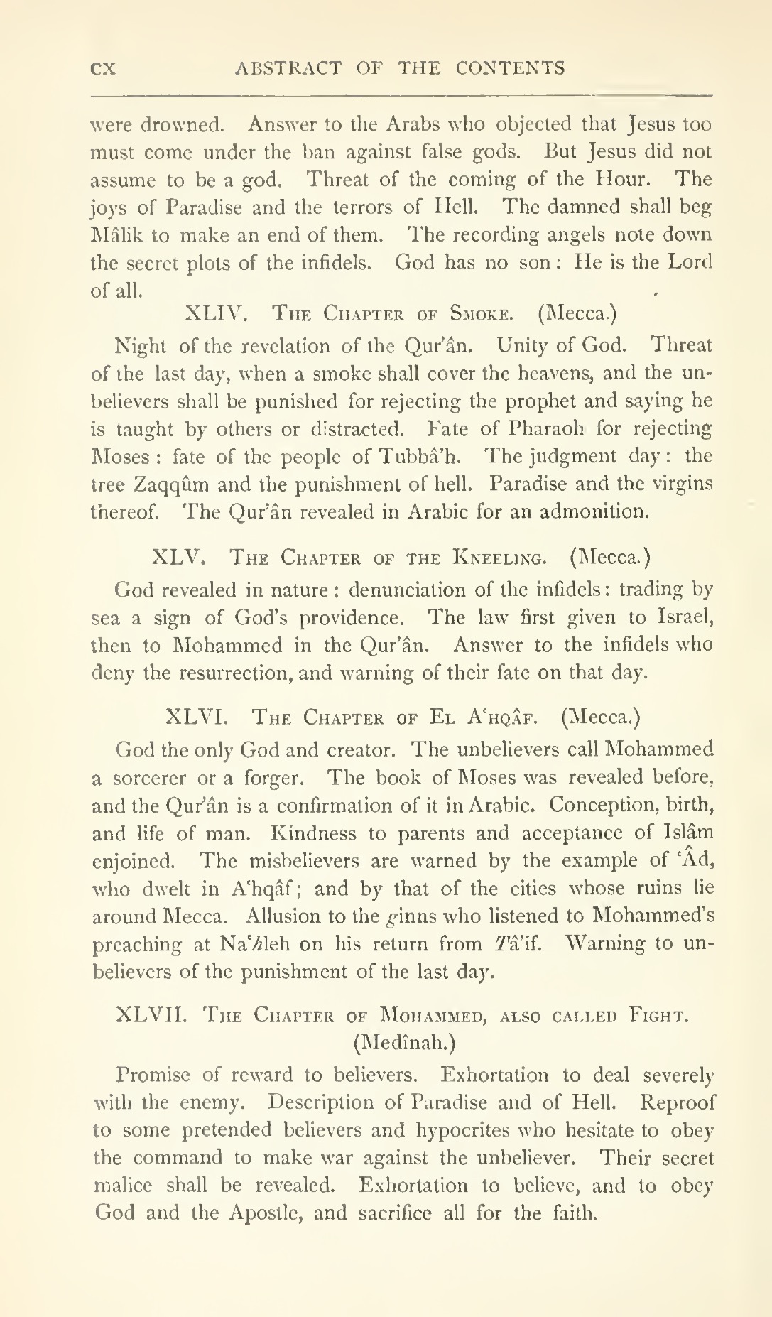 were drowned. Answer to the Arabs who objected that Jesus too must come under the ban against false gods. But Jesus did not assume to be a god. Threat of the coming of the Hour. The joys of Paradise and the terrors of Hell. The damned shall beg Mâlik to make an end of them. The recording angels note down the secret plots of the infidels. God has no son: He is the Lord of all.