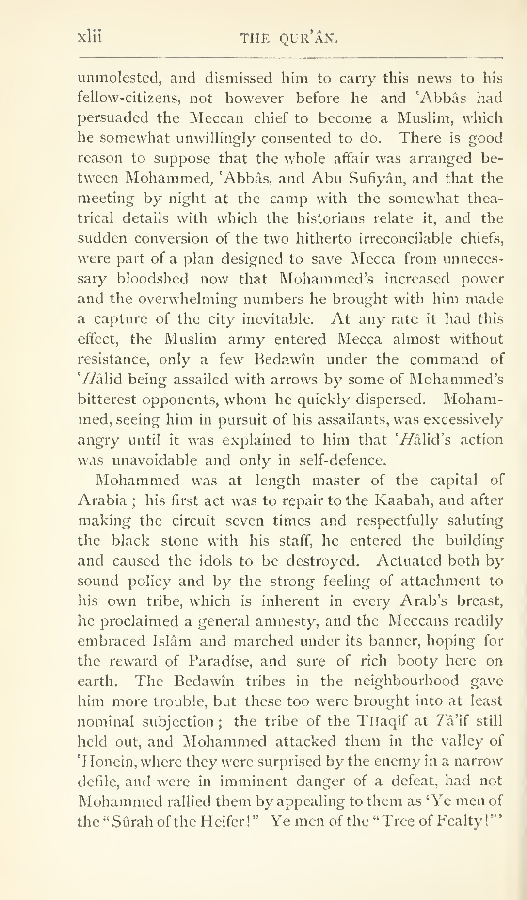 unmolested, and dismissed him to carry this news to his fellow-citizens, not however before he and ‘Abbâs had persuaded the Meccan chief to become a Muslim, which he somewhat unwillingly consented to do. There is good reason to suppose that the whole affair was arranged between Mohammed, ‘Abbâs, and Abu Sufiyân, and that the meeting by night at the camp with the somewhat theatrical details with which the historians relate it, and the sudden conversion of the two hitherto irreconcilable chiefs, were part of a plan designed to save Mecca from unnecessary bloodshed now that Mohammed’s increased power and the overwhelming numbers he brought with him made a capture of the city inevitable. At any rate it had this effect, the Muslim army entered Mecca almost without resistance, only a few Bedawîn under the command of ‘Hâlid being assailed with arrows by some of Mohammed’s bitterest opponents, whom he quickly dispersed. Mohammed, seeing him in pursuit of his assailants, was excessively angry until it was explained to him that ‘Hâlid’s action was unavoidable and only in self-defence.