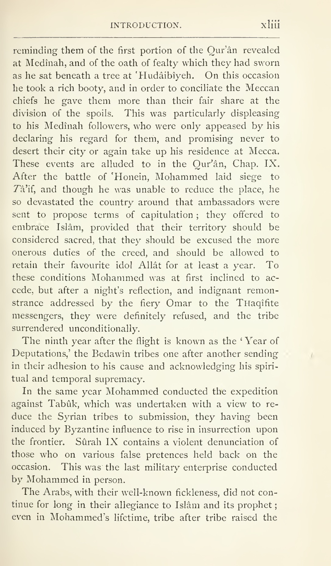reminding them of the first portion of the Qur’ân revealed at Medînah, and of the oath of fealty which they had sworn as he sat beneath a tree at ‘Hudâibîyeh. On this occasion he took a rich booty, and in order to conciliate the Meccan chiefs he gave them more than their fair share at the division of the spoils. This was particularly displeasing to his Medînah followers, who were only appeased by his declaring his regard for them, and promising never to desert their city or again take up his residence at Mecca. These events are alluded to in the Qur’ân, Chap. IX. After the battle of ‘Honein, Mohammed laid siege to Tâ’if, and though he was unable to reduce the place, he so devastated the country around that ambassadors were sent to propose terms of capitulation; they offered to embrace Islâm, provided that their territory should be considered sacred, that they should be excused the more onerous duties of the creed, and should be allowed to retain their favourite idol Allât for at least a year. To these conditions Mohammed was at first inclined to accede, but after a night’s reflection, and indignant remonstrance addressed by the fiery Omar to the Thaqîfite messengers, they were definitely refused, and the tribe surrendered unconditionally.