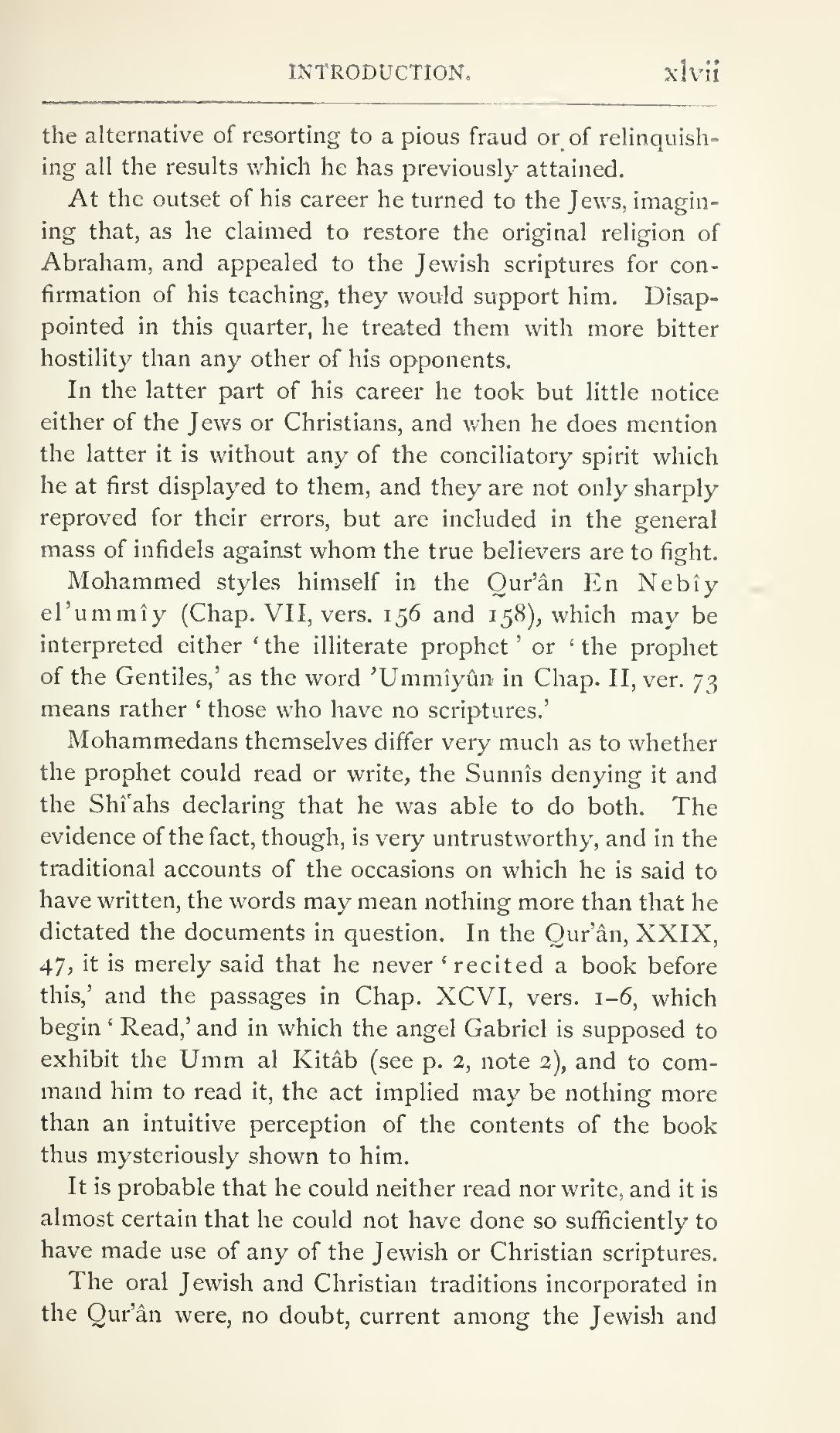 Mohammedans themselves differ very much as to whether the prophet could read or write, the Sunnîs denying it and the Shî‘ahs declaring that he was able to do both. The evidence of the fact, though, is very untrustworthy, and in the traditional accounts of the occasions on which he is said to have written, the words may mean nothing more than that he dictated the documents in question. In the Qur’ân, XXIX, 47, it is merely said that he never ‘recited a book before this,’ and the passages in Chap. XCVI, vers. 1–6, which begin ‘Read,’ and in which the angel Gabriel is supposed to exhibit the Umm al Kitâb (see p. 2, note 3), and to command him to read it, the act implied may be nothing more than an intuitive perception of the contents of the book thus mysteriously shown to him.