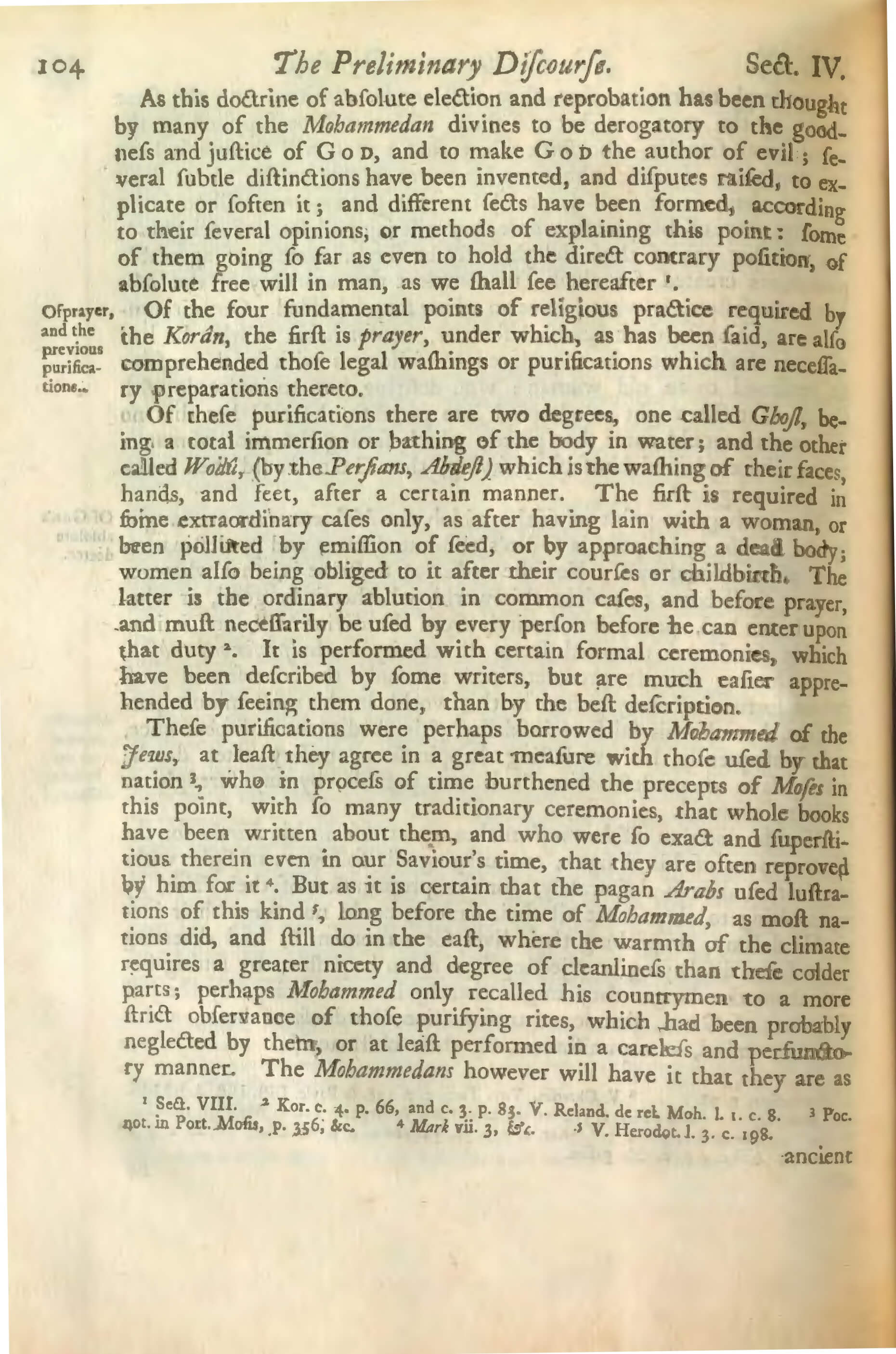 These purifications were perhaps borrowed by Mohammed of the Jews, at least they agree in a great measure with those used by that nation 3, who in process of time burthened the precepts of Moses in this point, with so many traditionary ceremonies, that whole books have been written about them, and who were so exact and superstitious therein even in our Saviour’s time, that they are often reproved by him for it 4. Buc as it is certain that the pagan Arabs used lustrations of this kind 5, long before the time of Mohammed, as most nations did, and still do in the east, where the warmth of the climate requires a greater nicery and degree of cleanliness than these colder parts; perhaps Mohammed only recalled his countrymen to a more strict observance of those purifying rites, which had been probably neglected by them, or at least performed in a careless and perfunctory manner. The Mohammedans however will have it that they are as
