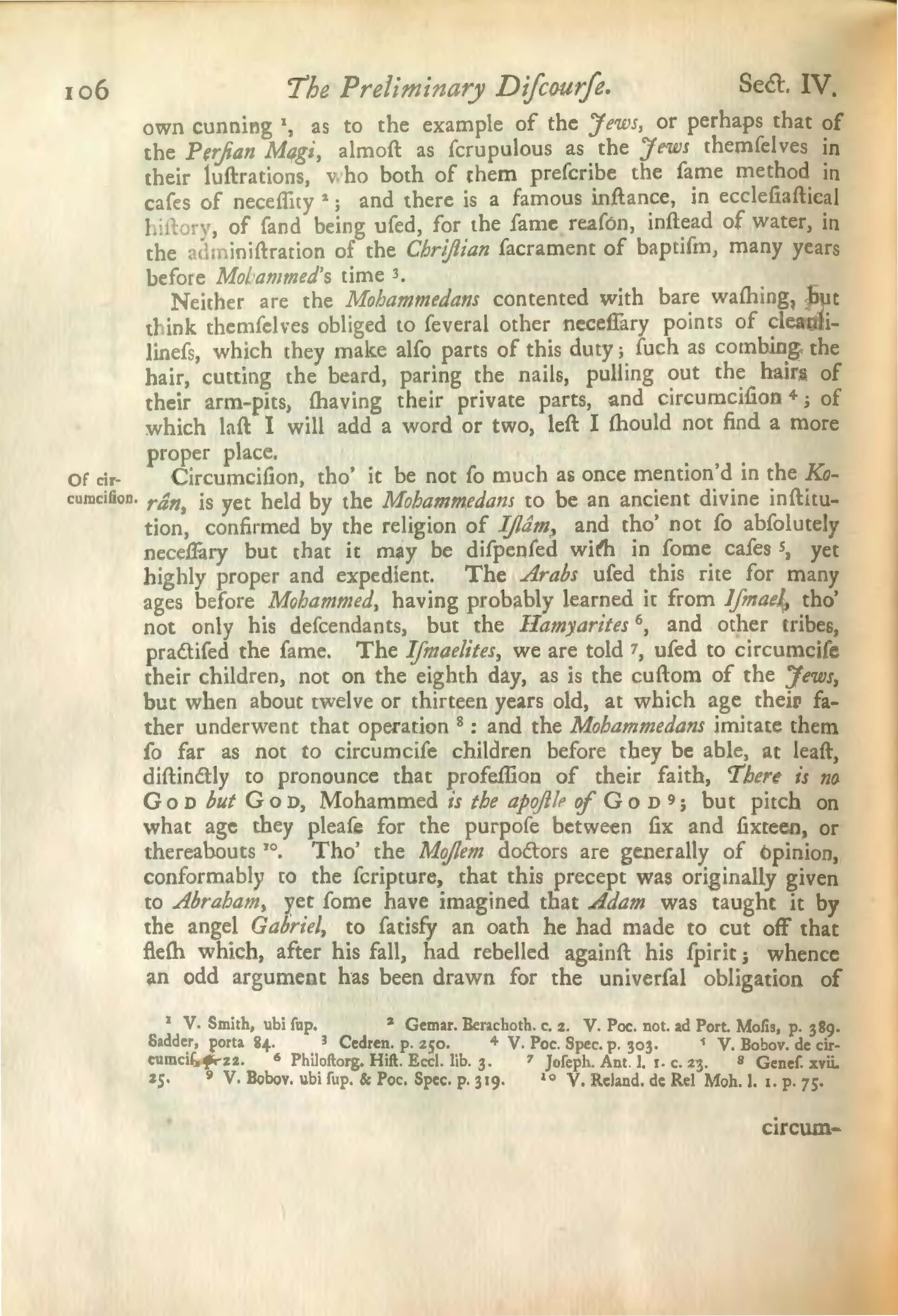 Circumcision, tho’ it be not so much as once mention’d in the Korân, is yet held by the Mohammedans to be an ancient divine institution, confirmed by the religion of Islâm, and tho’ not so absolutely necessary but that it may be dispensed with in some cases 5, yet highly proper and expedient. The Arabs used this rite for many ages before Mohammed, having probably learned it from Ismael, tho’ not only his descendants, but the Hamyarites 6, and other tribes, practised the same. The Ismaelites, we are told 7, used to circumcise their children, not on the eighth day, as is the custom of the Jews, but when about twelve or thirteen years old, at which age their father underwent that operation 8: and the Mohammedans imitate them so far as not to circumcise children before they be able, at least, distinctly to pronounce that profession of their faith, There is no God but God, Mohammed is the apostle of God 9; but pitch on what age they please for the purpose between six and sixteen, or thereabouts 10. Tho’ the Moslem doctors are generally of opinion, conformably to the scripture, that this precept was originally given to Abraham, yet some have imagined that Adam was taught it by the angel Gabriel, to satisfy an oath he had made to cut off that flesh which, after his fall, had rebelled against his spirit; whence an odd argument has been drawn for the universal obligation of