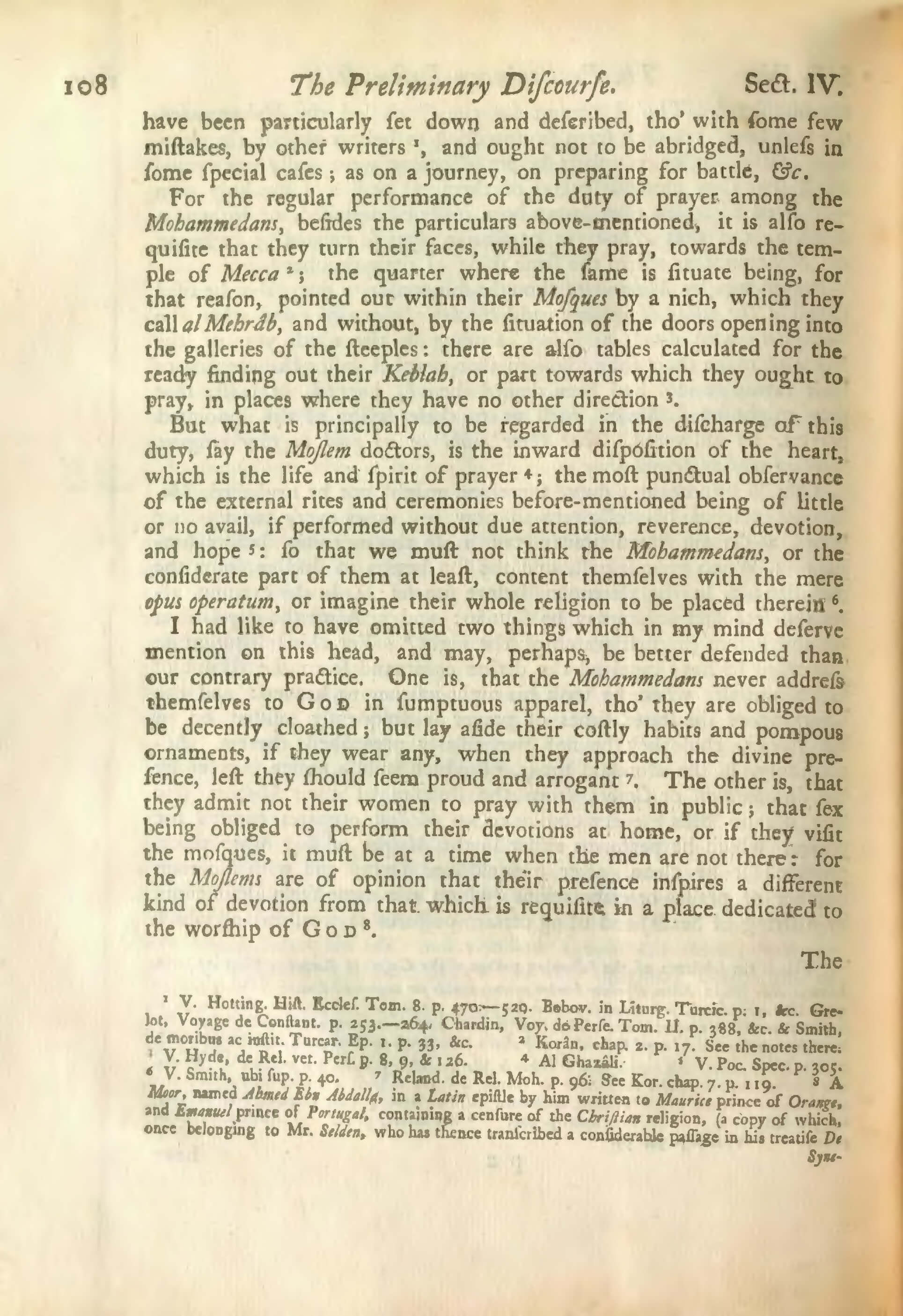 I had like to have omitted two things which in my mind deserve mention on this head, and may, perhaps, be better defended than our contrary practice. One is, that the Mohammedans never address themselves to God in sumptuous apparel, tho’ they are obliged to be decently cloathed; but lay aside their costly habits and pompous ornaments, if they wear any, when they approach the divine presence, left they should seem proud and arrogant 7. The other is, that they admit not their women to pray with them in public; that sex being obliged to perform their devotions at home, or if they visit the mosques, it must be at a time when the men are not there: for the Moslems are of opinion that their presence inspires a different kind of devotion from that which is requisite in a place dedicated to the worship of God 8.