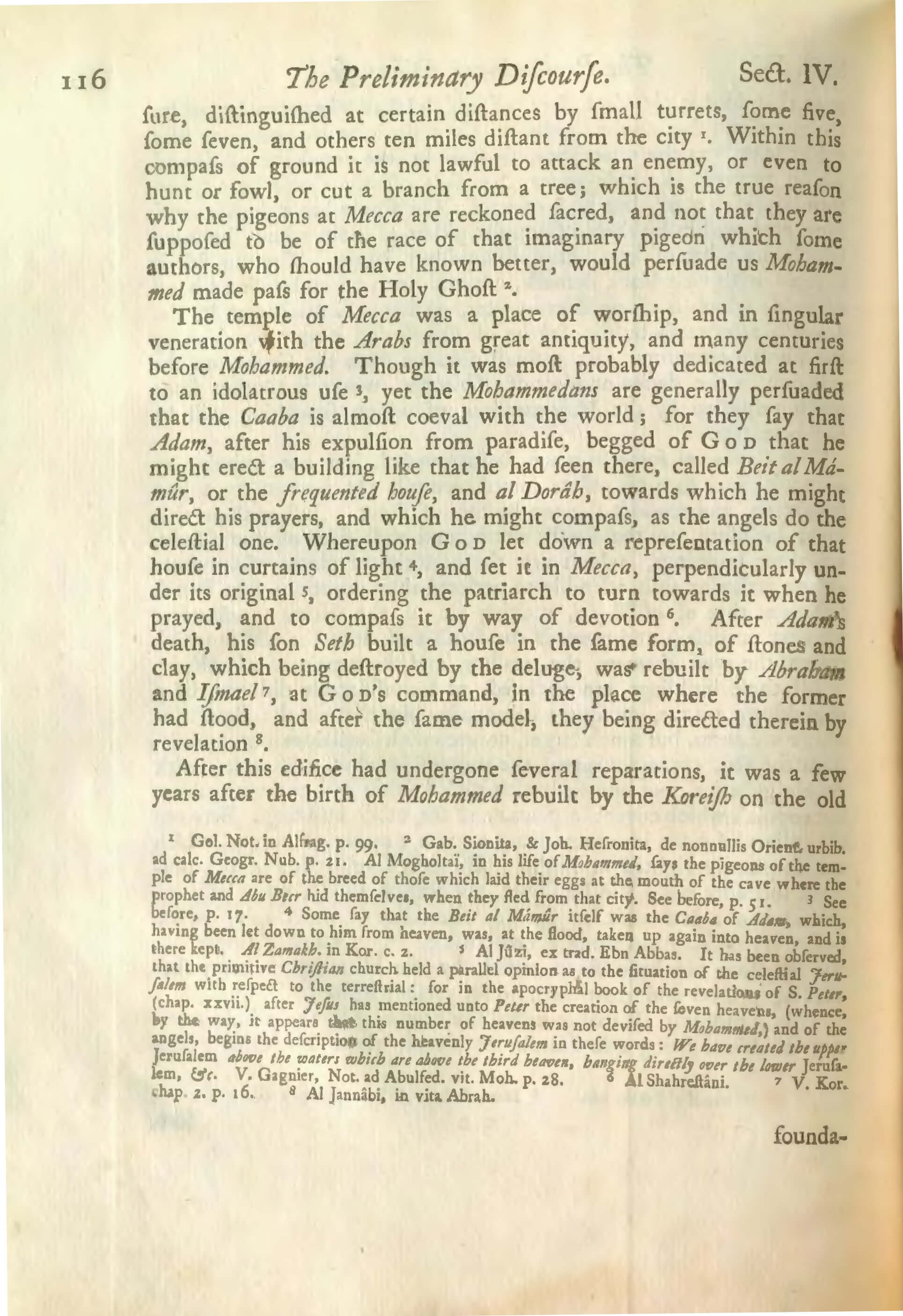 enclosure, distinguished at certain distances by small turrets, some five, some seven, and others ten miles distant from the city 1. Within this compass of ground it is not lawful to attack an enemy, or even to hunt or fowl, or cut a branch from a tree; which is the true reason why the pigeons at Mecca are reckoned sacred, and not that they are supposed to be of the race of that imaginary pigeon which some authors, who should have known better, would persuade us Mohammed made pass for the Holy Ghost 2.