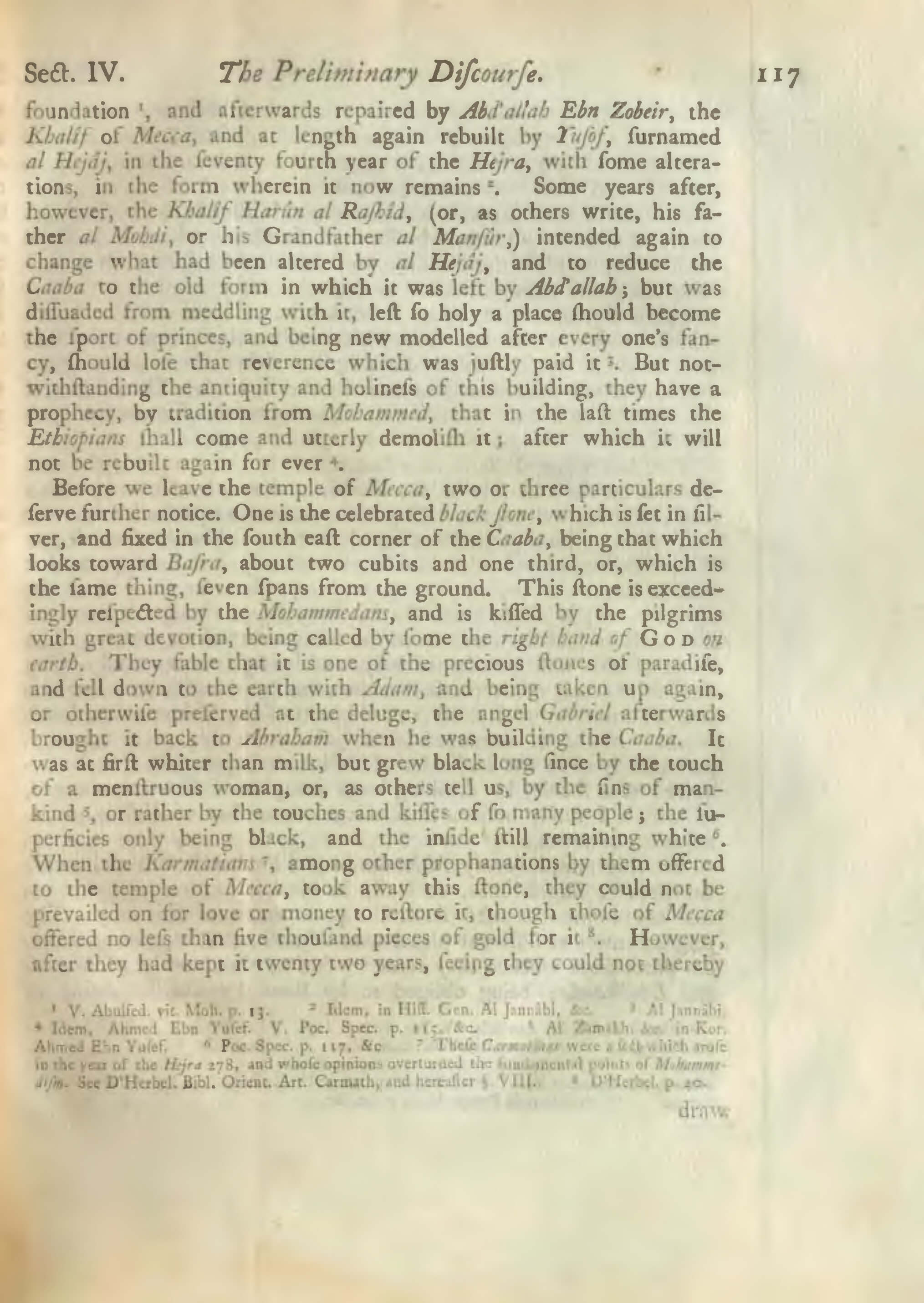 Before we leave the temple of Mecca, two or three particulars deserve further notice. One is the celebrated black stone, which is set in silver, and fixed in the south east corner of the Caaba, being that which looks toward Basra, about two cubics and one third, or, which is the same thing, seven spans from the ground. This stone is exceedingly respected by the Mohammedans, and is kissed by the pilgrims with great devotion, being called by some the right hand of God on earth. They fable that it is one of the precious stones of paradise, and fell down to the earth with Adam, and being taken up again, or otherwise preserved at the deluge, the angel Gabriel afterwards brought it back to Abraham when he was building the Caaba. It was at first whiter than milk, but grew black long since by the touch of a menstruous woman, or, as others tell us, by the sins of mankind 5, or rather by the touches and kisses of so many people; the superficies only being black, and the inside still remaining white 6. When the Karmatians 7, among other prophanations by them offered to the temple of Mecca, took away this stone, they could not be prevailed on for love or money to restore it, though those of Mecca offered no less than five thousand pieces of gold for it 8. However, after they had kept it twenty two years, seeing they could not thereby