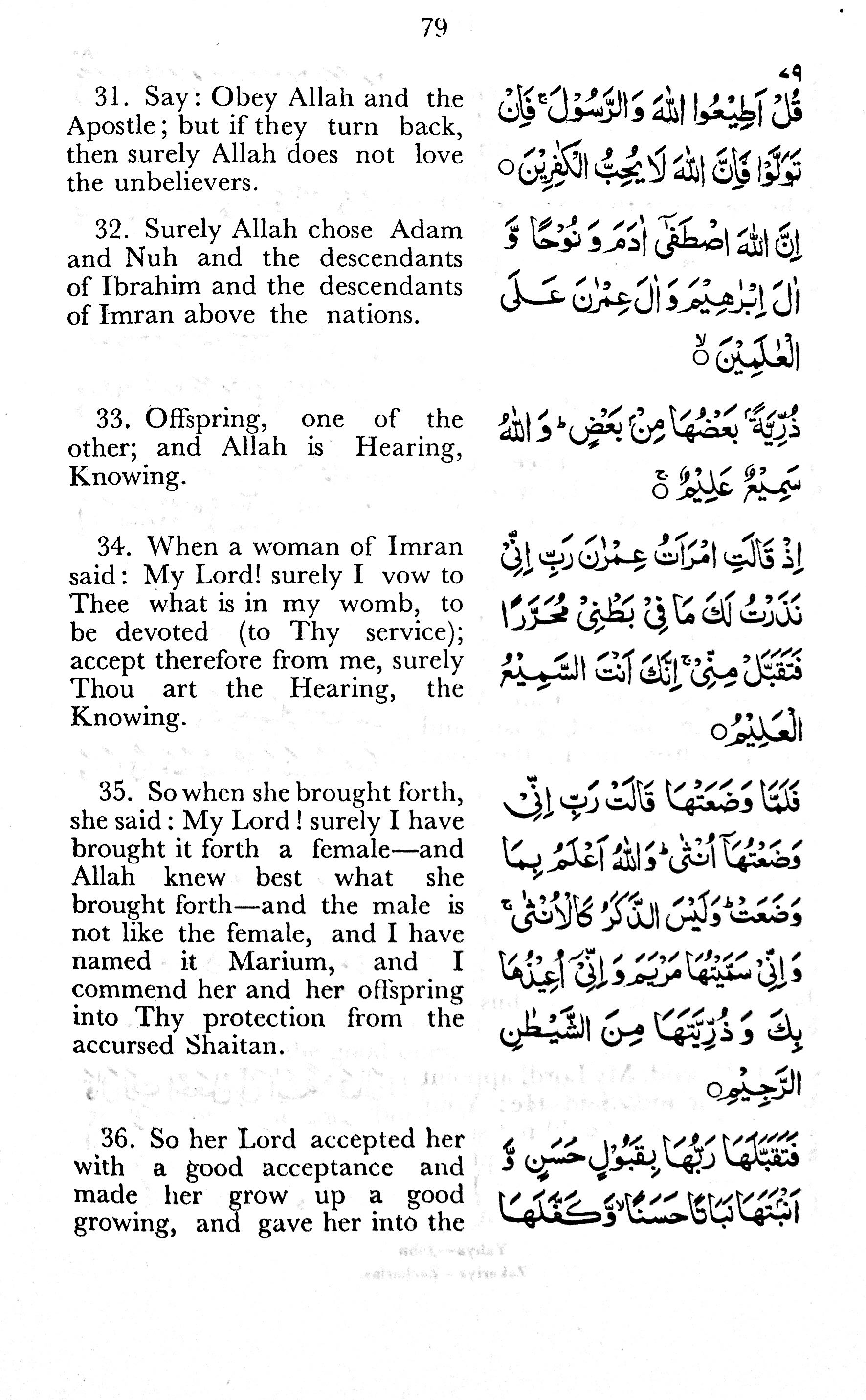 34. When a woman of Imran said: My Lord! surely I vow to Thee what is in my womb, to be devoted (to Thy service); accept therefore from me, surely Thou art the Hearing, the Knowing.