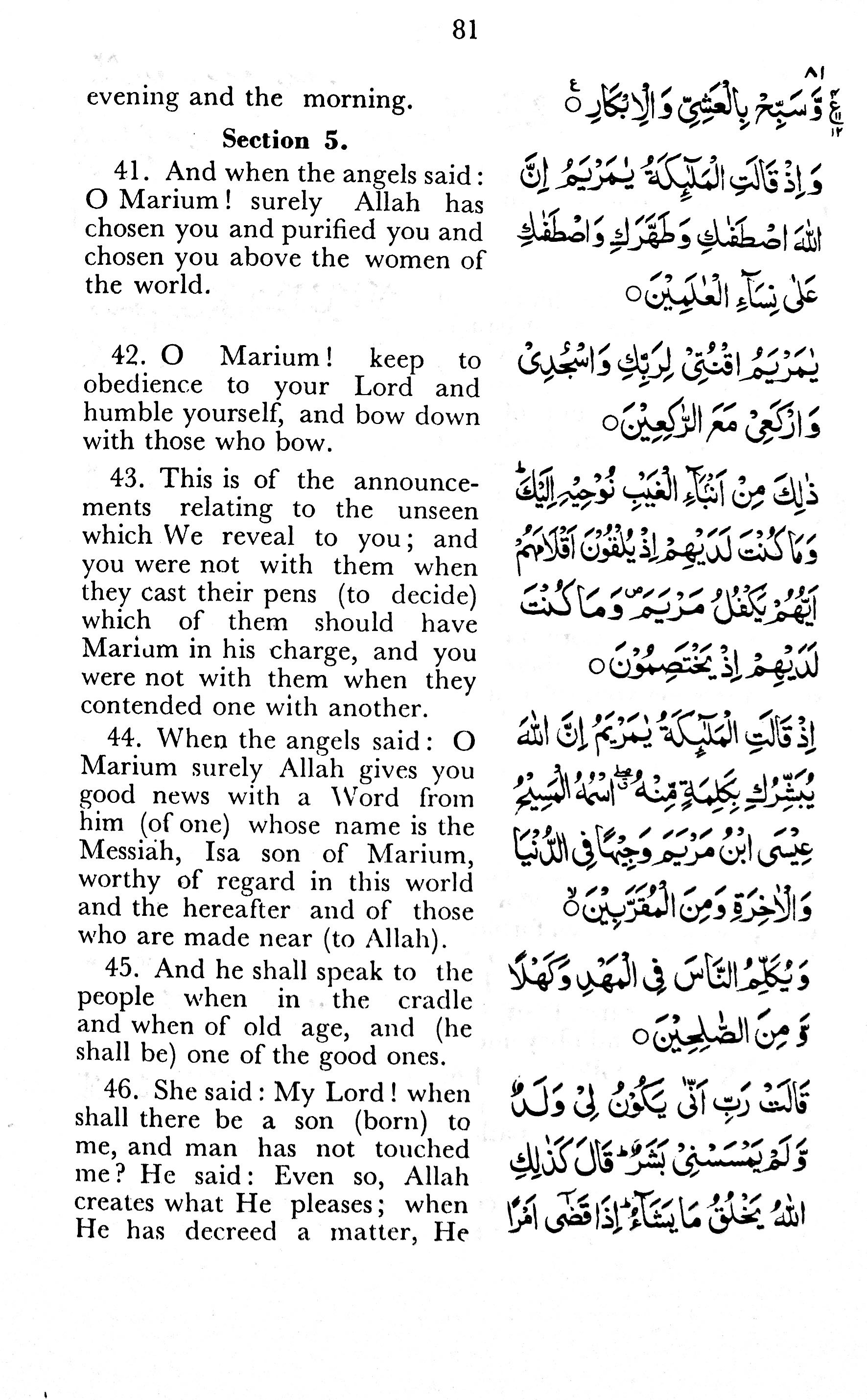 44. When the angels said: O Marium surely Allah gives you good news with a Word from him (of one) whose name is the Messiah, Isa son of Marium, worthy of regard in this world and the hereafter and of those who are made near (to Allah).