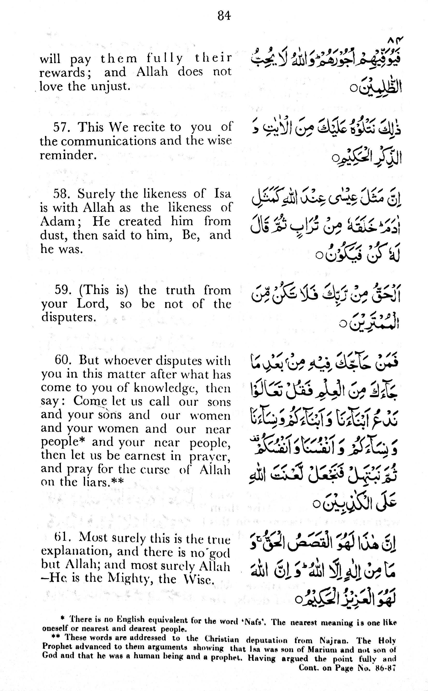 60. But whoever disputes with you in this matter after what has come to you of knowledge, then say: Come let us call our sons and your sons and our women and your women and our near people* and your near people, then let us be earnest in prayer, and pray for the curse of Allah on the liars.**