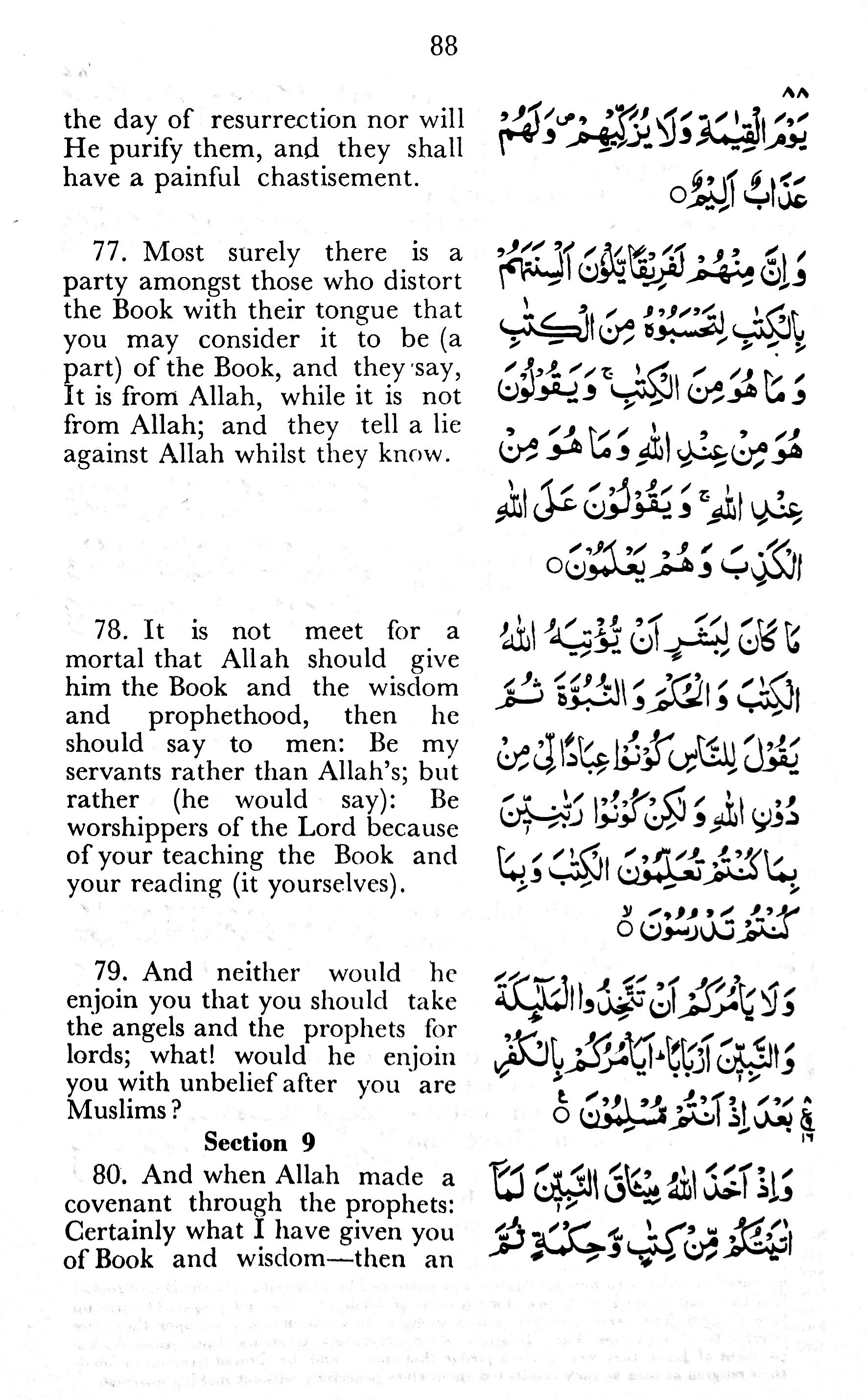 79. And neither would he enjoin you that you should take the angels and the prophets for lords; what! would he enjoin you with unbelief after you are Muslims?