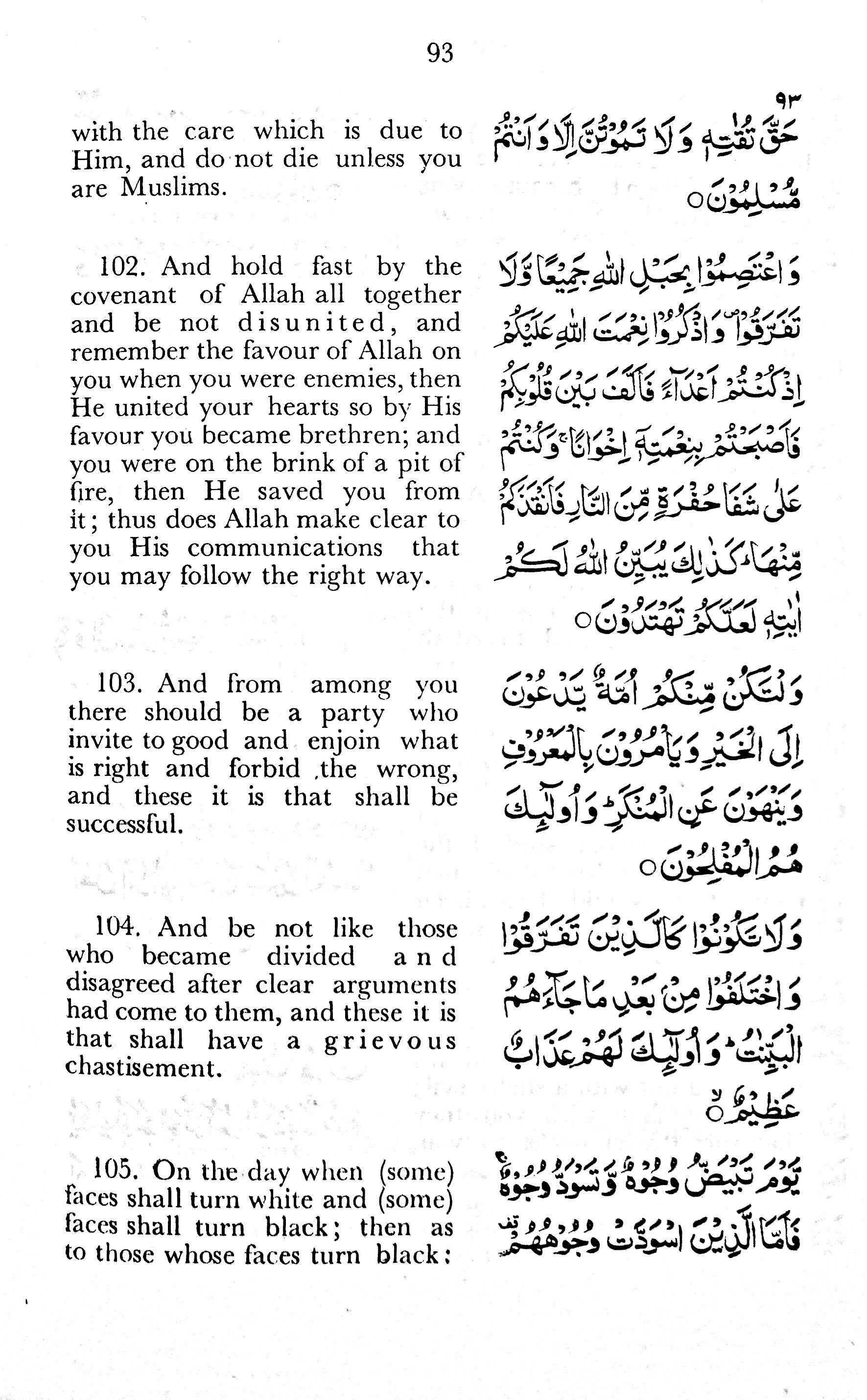 102. And hold fast by the covenant of Allah all together and be not disunited, and remember the favour of Allah on you when you were enemies, then He united your hearts so by His favour you became brethren; and you were on the brink of a pit of fire, then He saved you from it; thus does Allah make clear to you His communications that you may follow the right way.