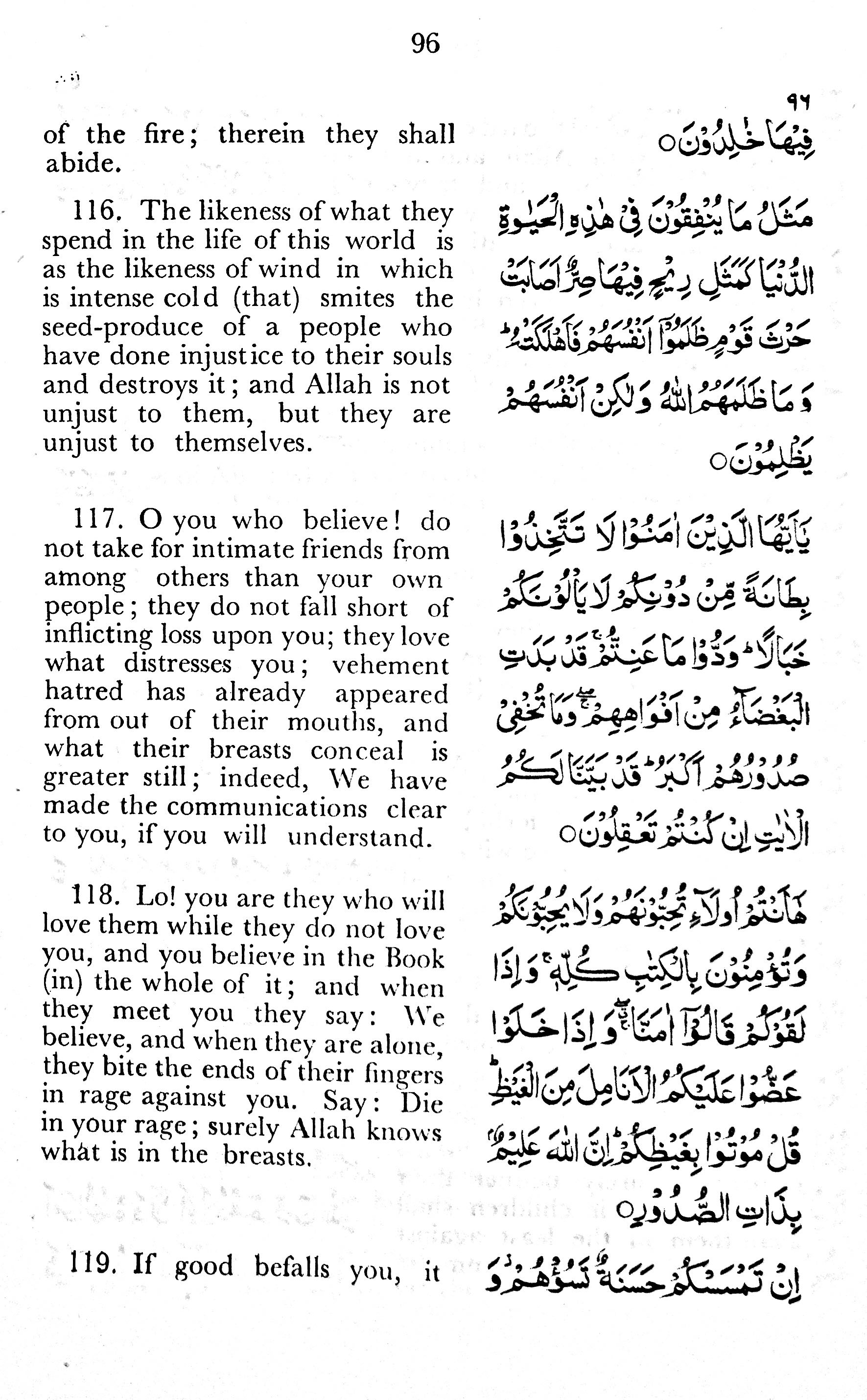 117. O you who believe! do not take for intimate friends from among others than your own people; they do not fall short of inflicting loss upon you; they love what distresses you; vehement hatred has already appeared from out of their mouths, and what their breasts conceal is greater still; indeed, We have made the communications clear to you, if you will understand.