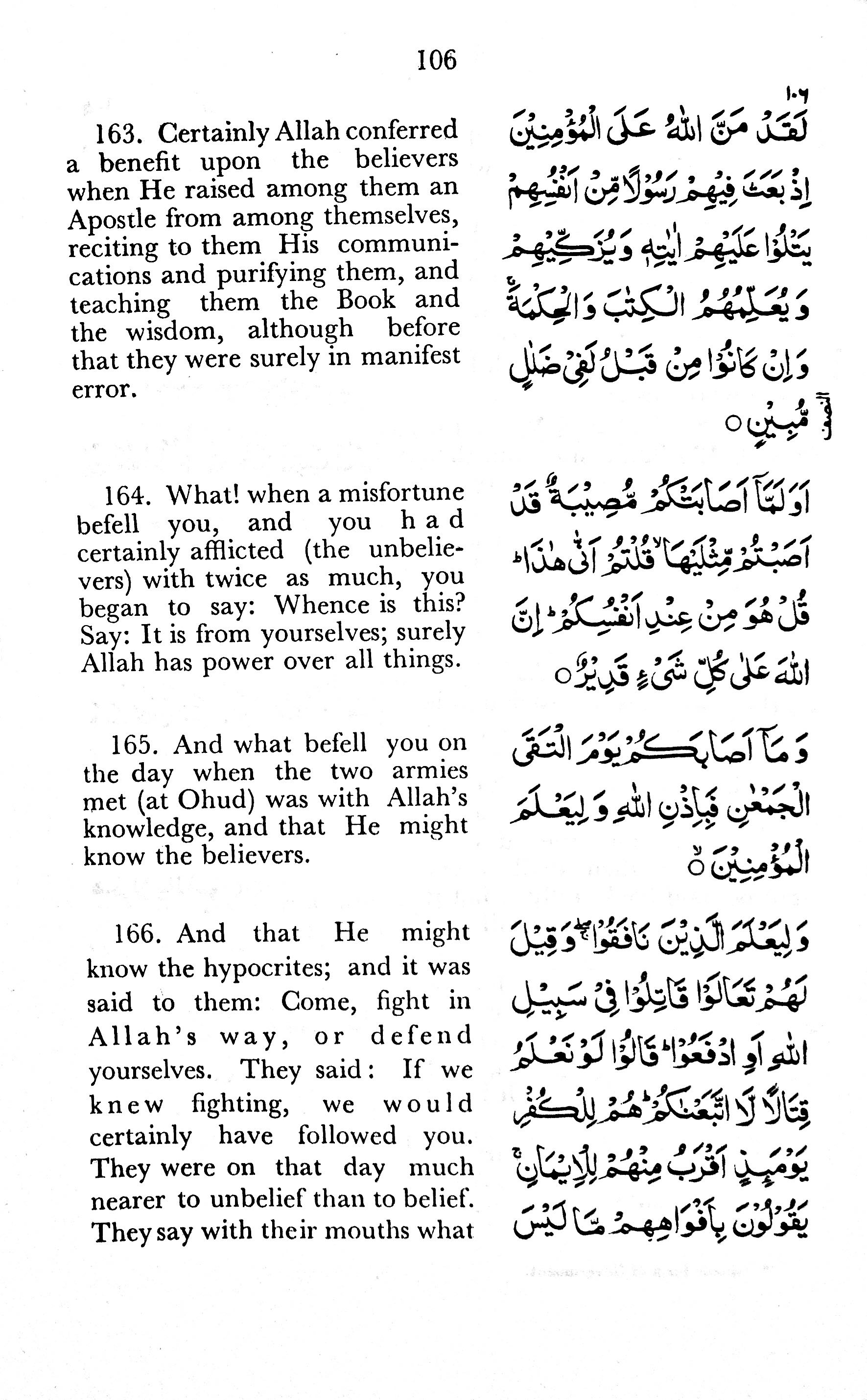 163. Certainly Allah conferred a benefit upon the believers when He raised among them an Apostle from among themselves, reciting to them His communications and purifying them, and teaching them the Book and the wisdom, although before that they were surely in manifest error.