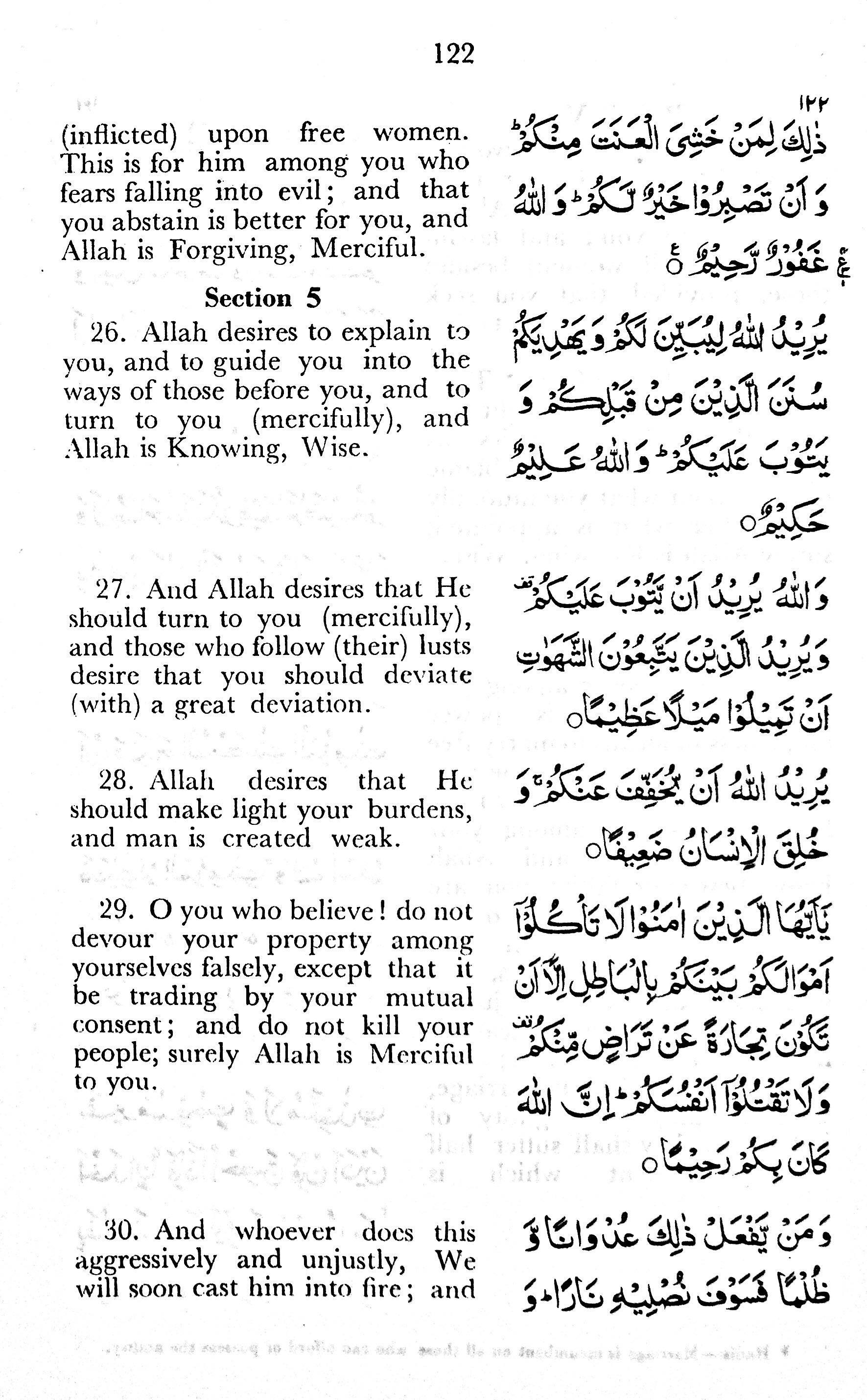 26. Allah desires to explain to you, and to guide you into the ways of those before you, and to turn to you (mercifully), and Allah is Knowing, Wise.