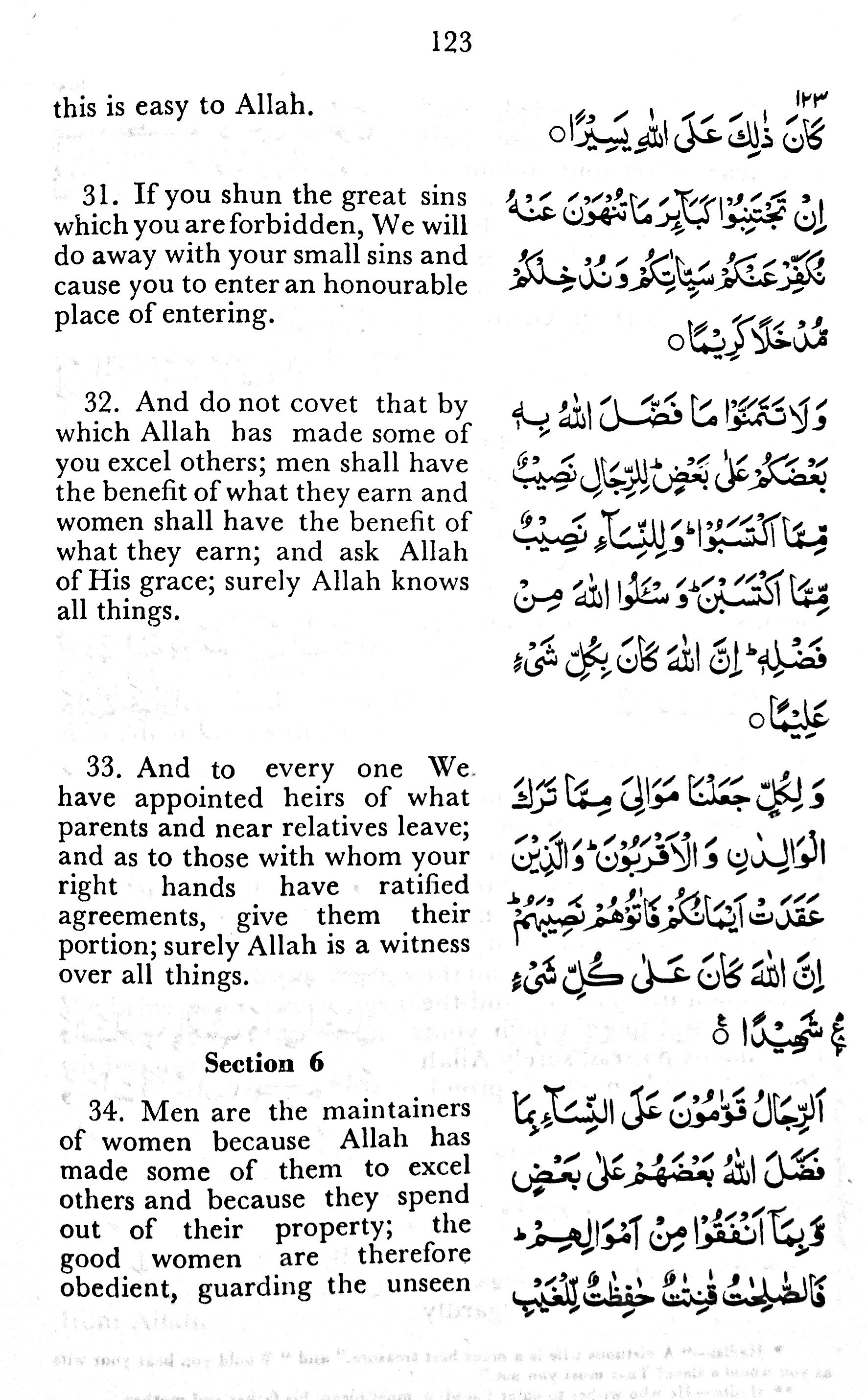 34. Men are the maintainers of women because Allah has made some of them to excel others and because they spend out of their property; the good women are therefore obedient, guarding the unseen