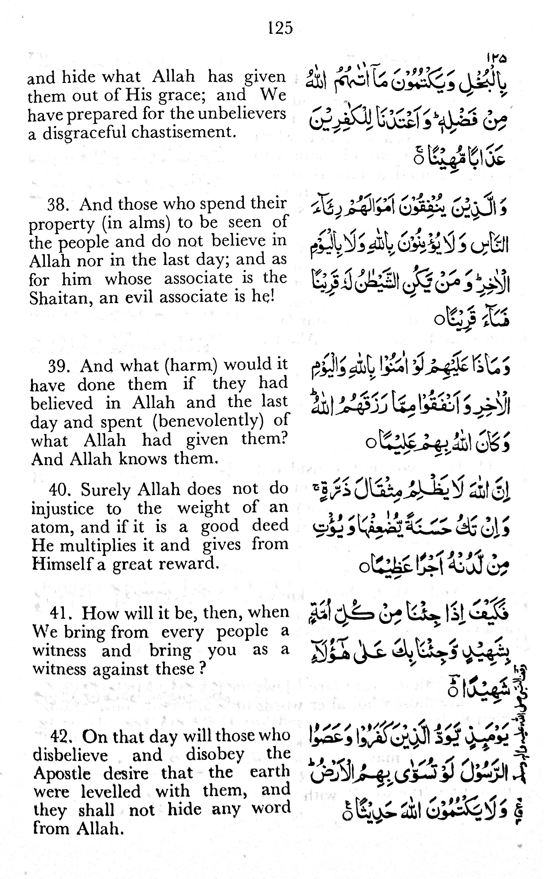 38. And those who spend their property (in alms) to be seen of the people and do not believe in Allah nor in the last day; and as for him whose associate is the Shaitan, an evil associate is he!