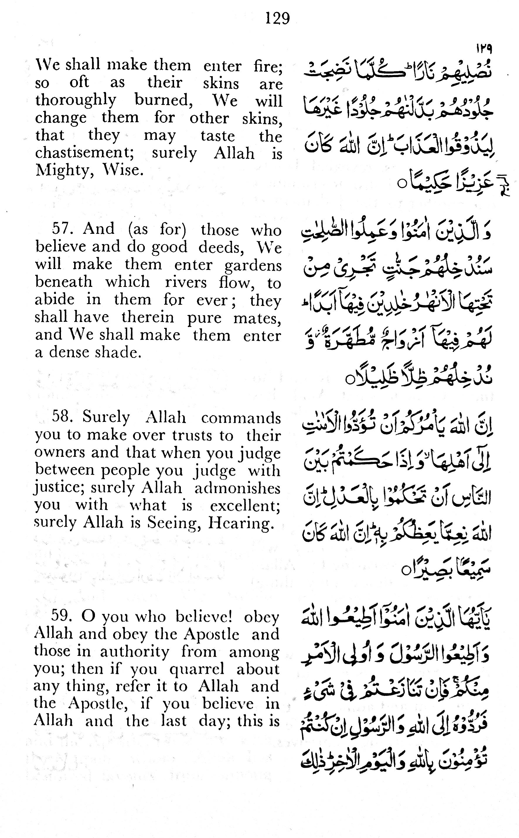 58. Surely Allah commands you to make over trusts to their owners and that when you judge between people you judge with justice; surely Allah admonishes you with what is excellent; surely Allah is Seeing, Hearing.