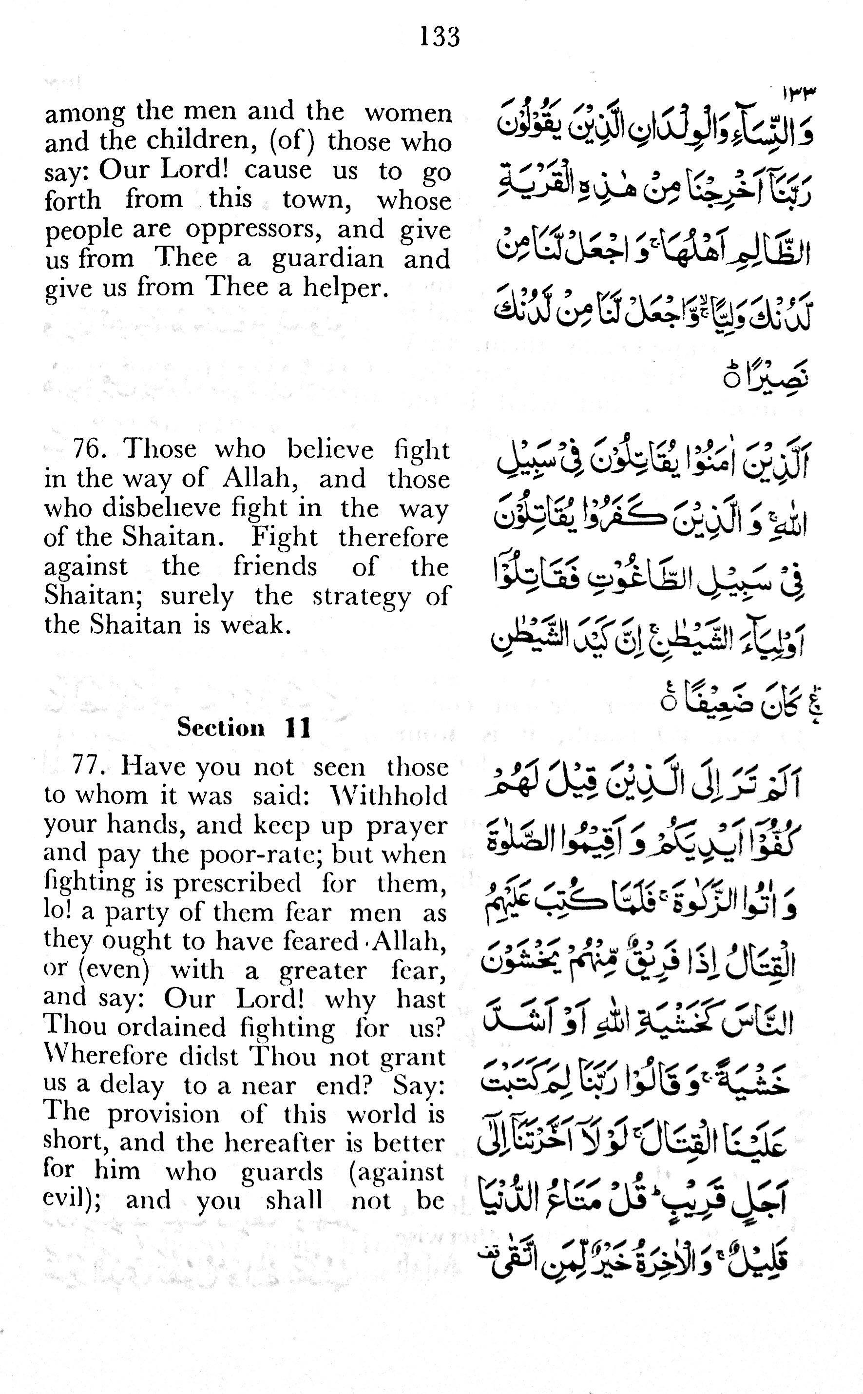 77. Have you not seen those to whom it was said: Withhold your hands, and keep up prayer and pay the poor-rate; but when fighting is prescribed for them, lo! a party of them fear men as they ought to have feared Allah, or (even) with a greater fear, and say: Our Lord! why hast Thou ordained fighting for us? Wherefore didst Thou not grant us a delay to a near end? Say: The provision of this world is short, and the hereafter is better for him who guards (against evil); and you shall not be