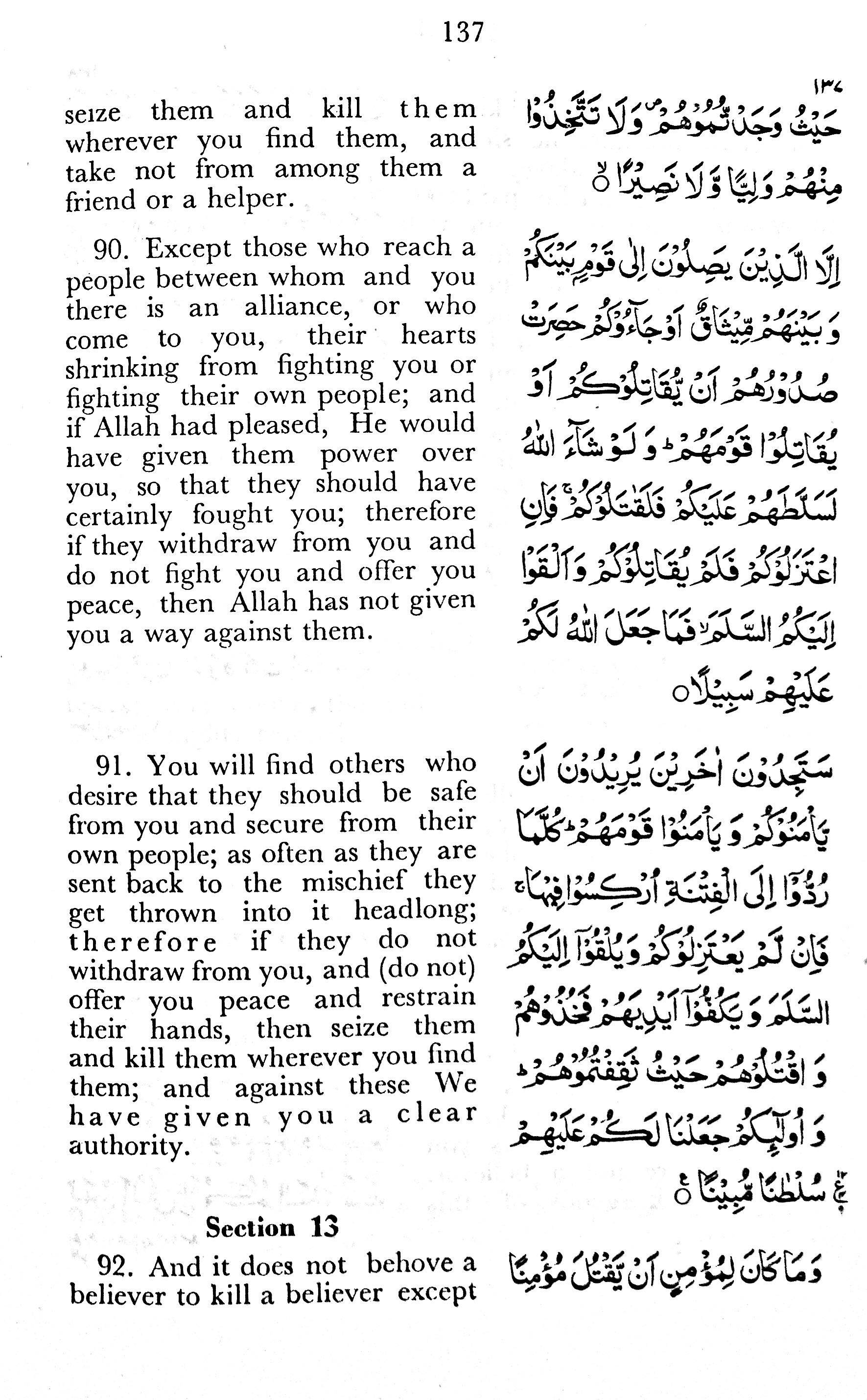 91. You will find others who desire that they should be safe from you and secure from their own people; as often as they are sent back to the mischief they get thrown into it headlong; therefore if they do not withdraw from you, and (do not) offer you peace and restrain their hands, then seize them and kill them wherever you find them; and against these We have given you a clear authority.