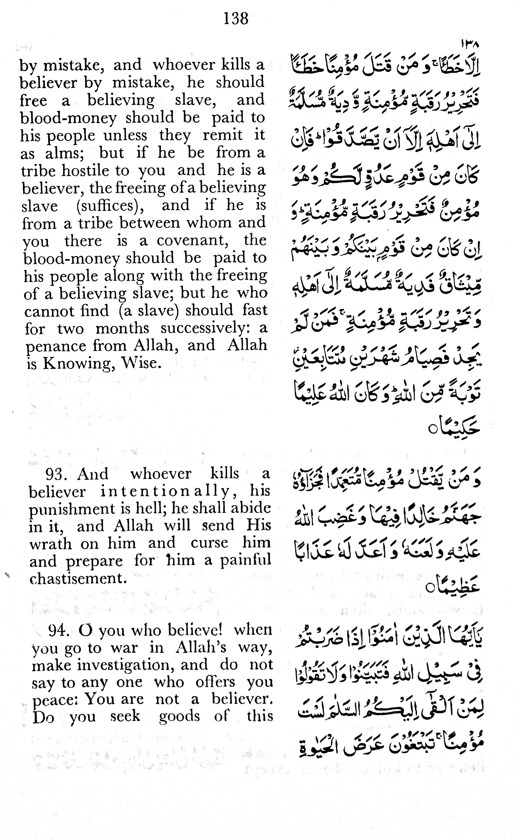 93. And whoever kills a believer intentionally, his punishment is hell; he shall abide in it, and Allah will send His wrath on him and curse him and prepare for him a painful chastisement.