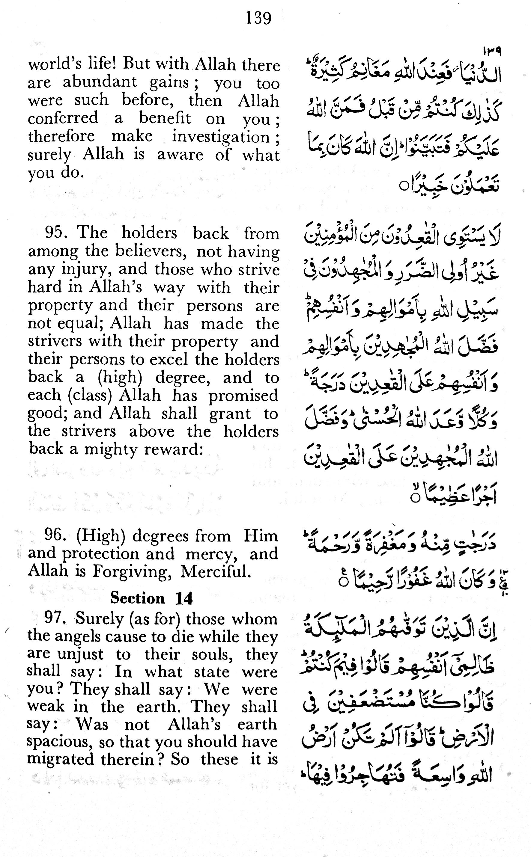 95. The holders back from among the believers, not having any injury, and those who strive hard in Allah’s way with their property and their persons are not equal; Allah has made the strivers with their property and their persons to excel the holders back a (high) degree, and to each (class) Allah has promised good; and Allah shall grant to the strivers above the holders back a mighty reward: