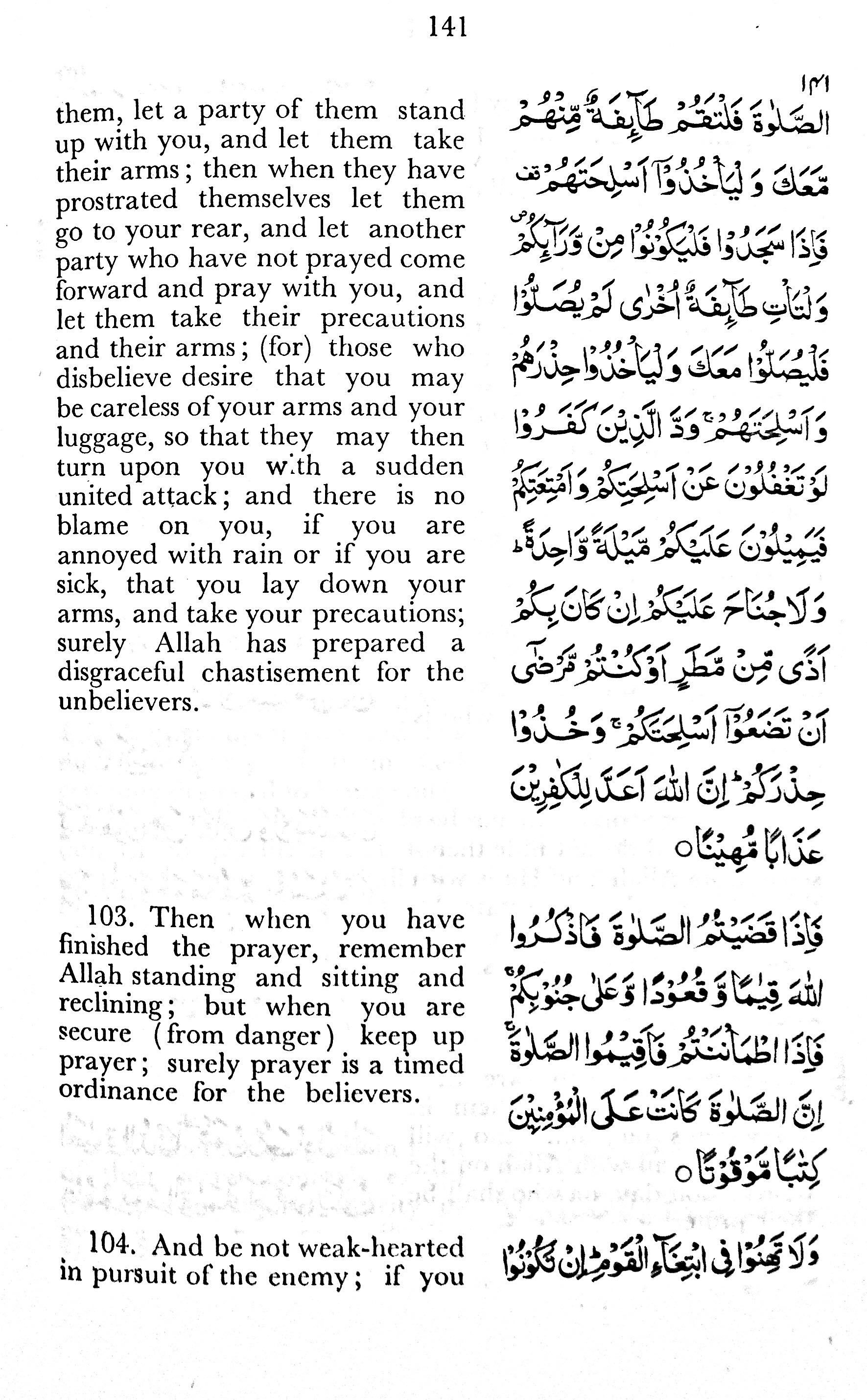them, let a party of them stand up with you, and let them take their arms; then when they have prostrated themselves let them go to your rear, and let another party who have not prayed come forward and pray with you, and let them take their precautions and their arms; (for) those who disbelieve desire that you may be careless of your arms and your luggage, so that they may then turn upon you with a sudden united attack; and there is no blame on you, if you are annoyed with rain or if you are sick, that you lay down your arms, and take your precautions; surely Allah has prepared a disgraceful chastisement for the unbelievers.