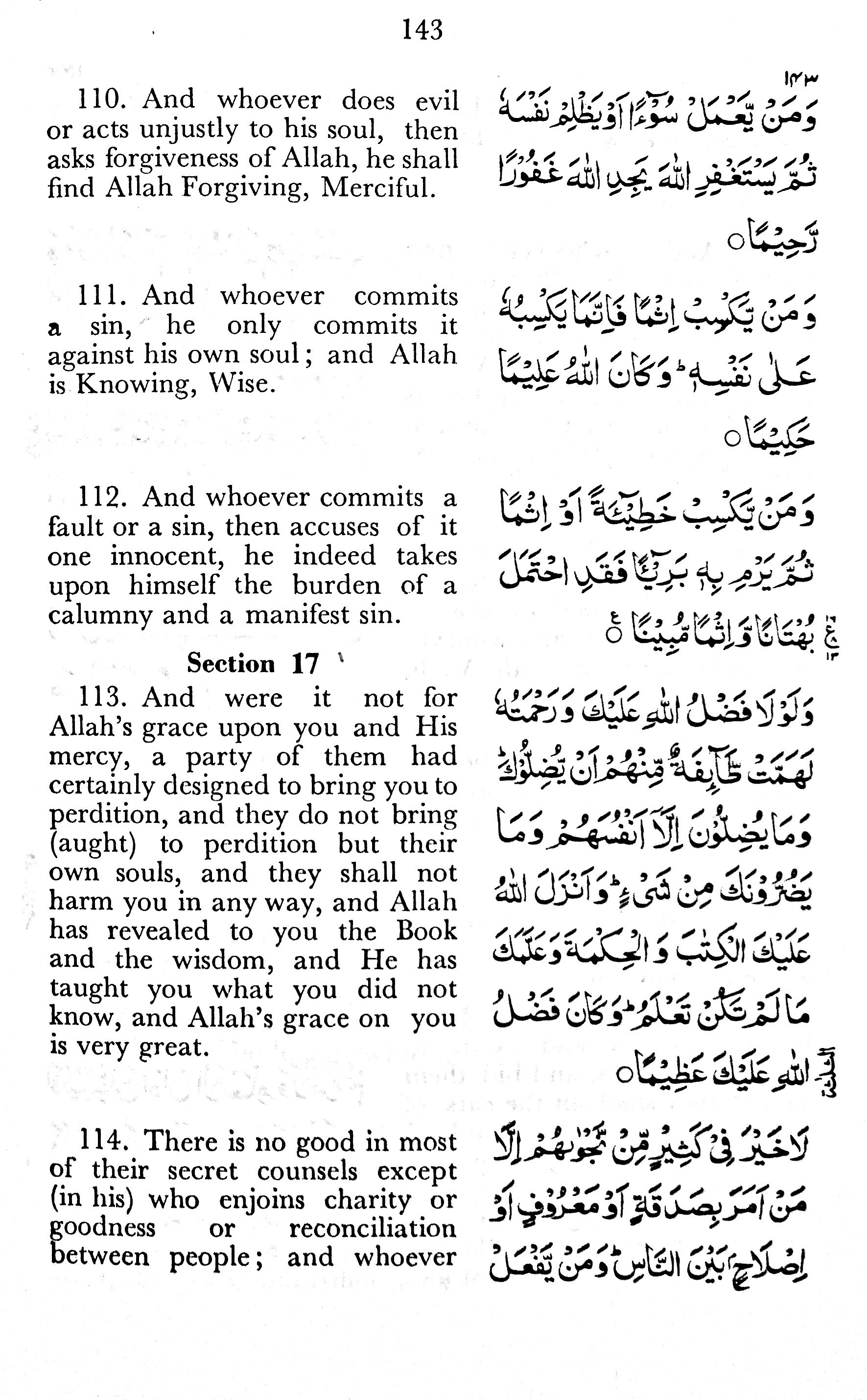 114. There is no good in most of their secret counsels except (in his) who enjoins charity or goodness or reconciliation Between people; and whoever