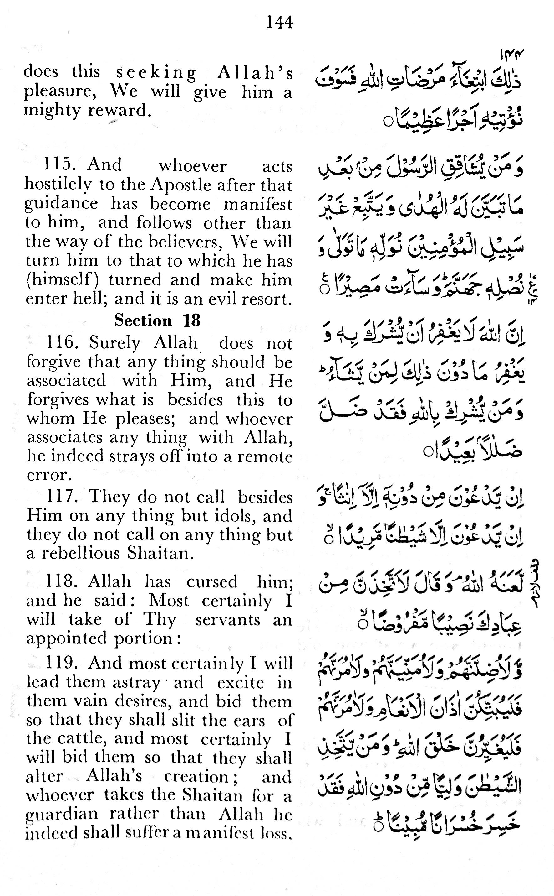 119. And most certainly I will lead them astray and excite in (hem vain desires, and bid them so that they shall slit the ears of the cattle, and most certainly I will bid them so that they shall alter Allah’s creation; and whoever takes the Shaitan for a guardian rather than Allah he indeed shall suffer a manifest loss.