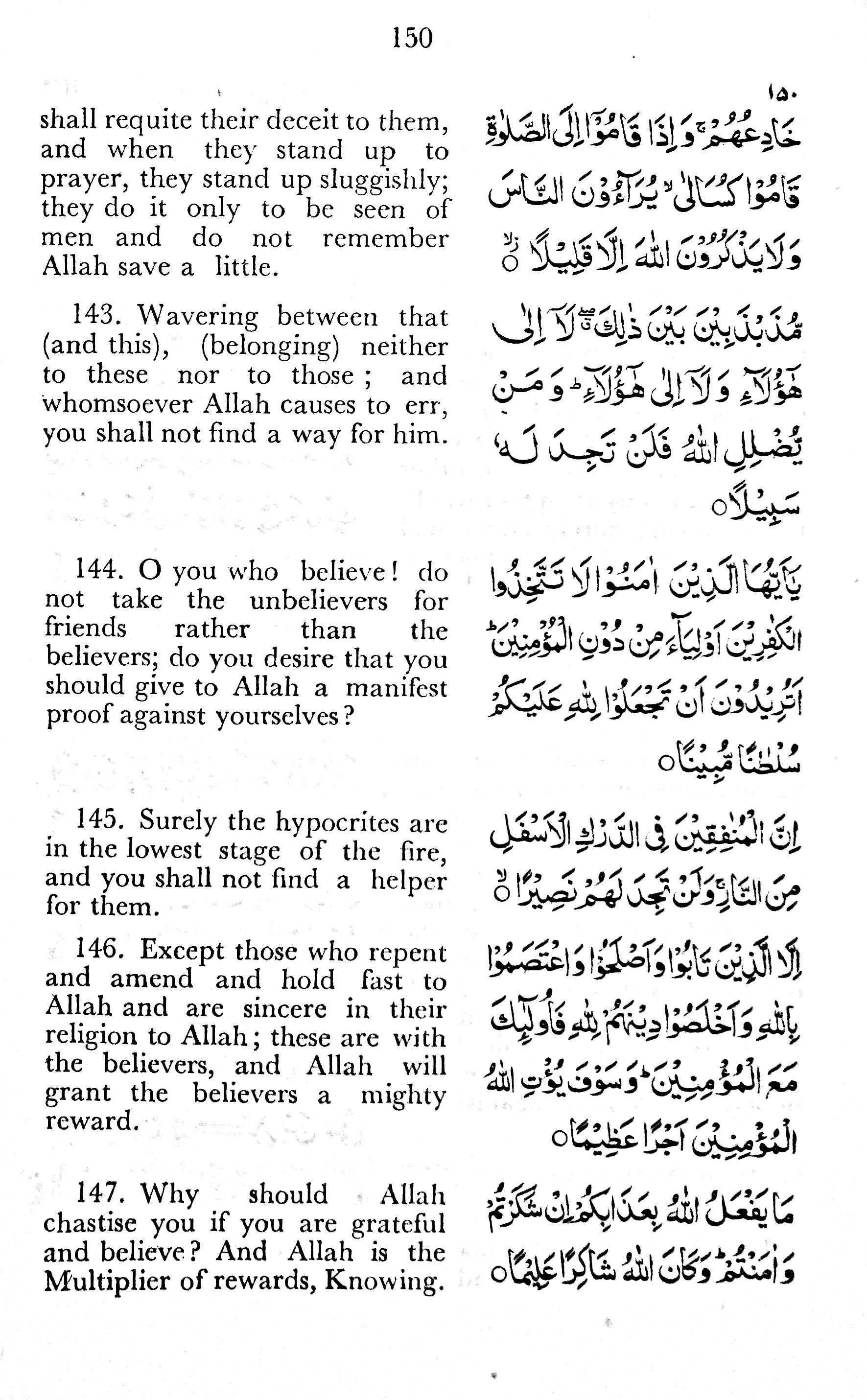 145. Surely the hypocrites are in the lowest stage of the fire, and you shall not find a helper for them.