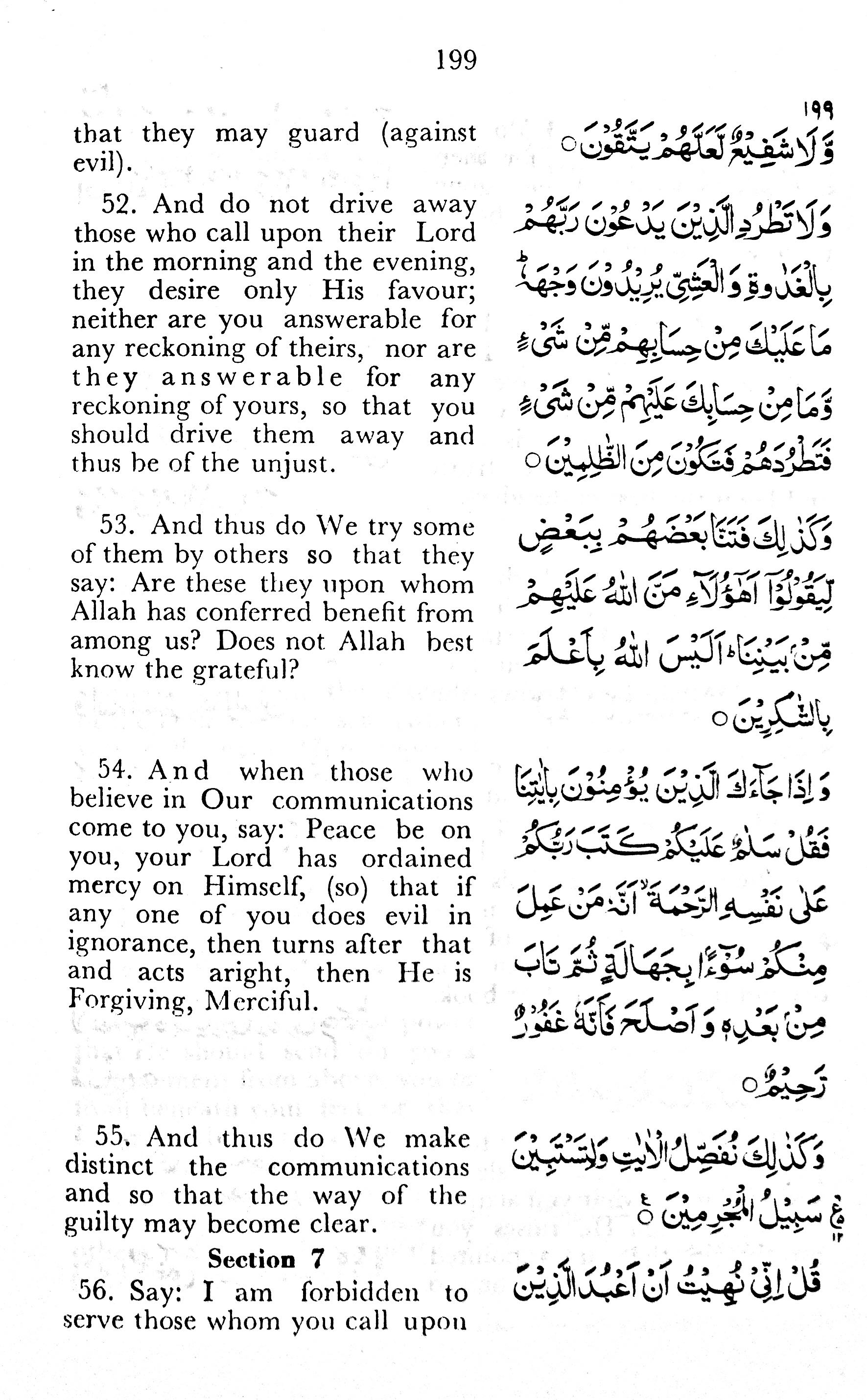 52. And do not drive away those who call upon their Lord in the morning and the evening, they desire only His favour; neither are you answerable for any reckoning of theirs, nor are they answerable for any reckoning of yours, so that you should drive them away and thus be of the unjust.