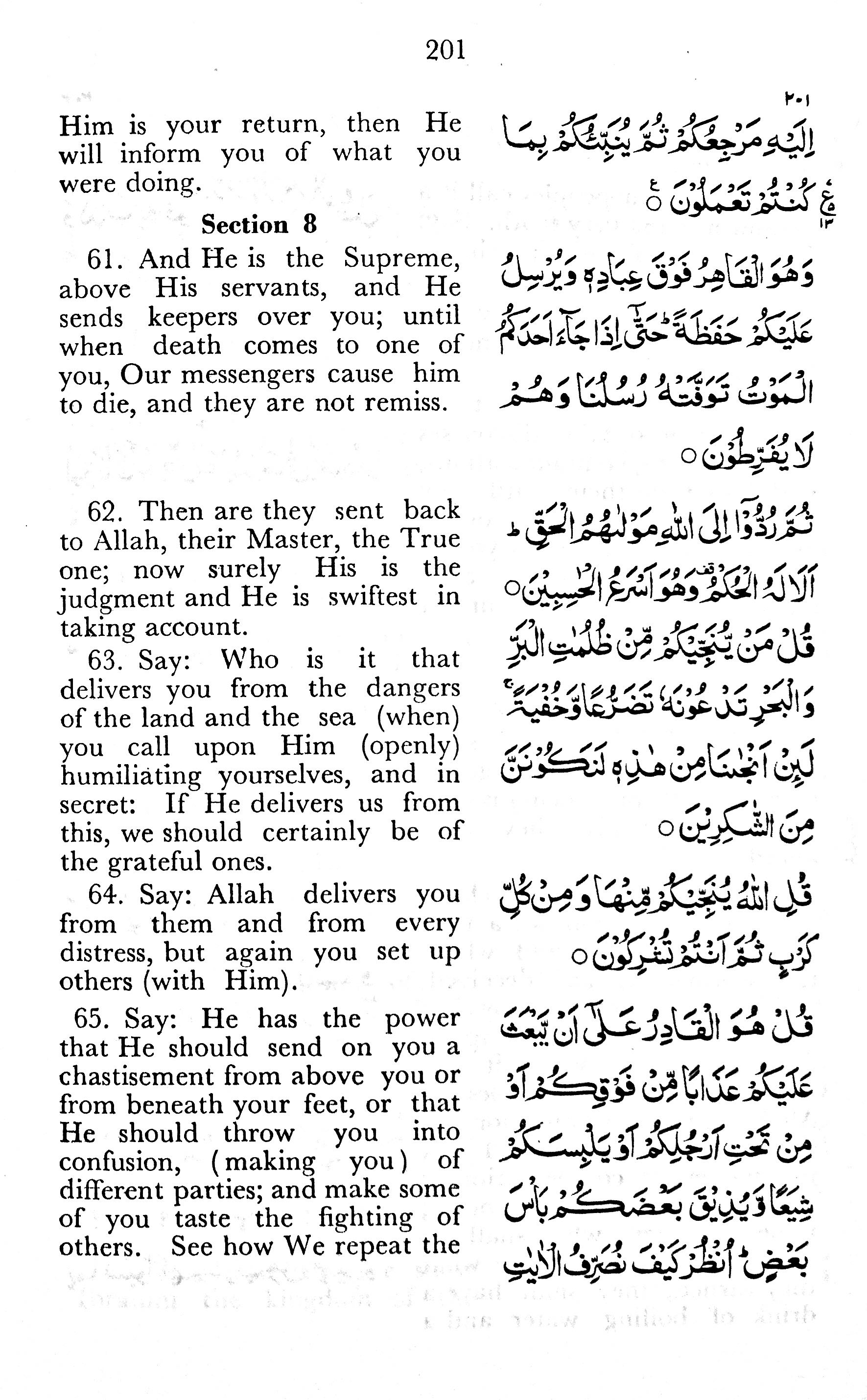 61. And He is the Supreme, above His servants, and He sends keepers over you; until when death comes to one of you, Our messengers cause him to die, and they are not remiss.