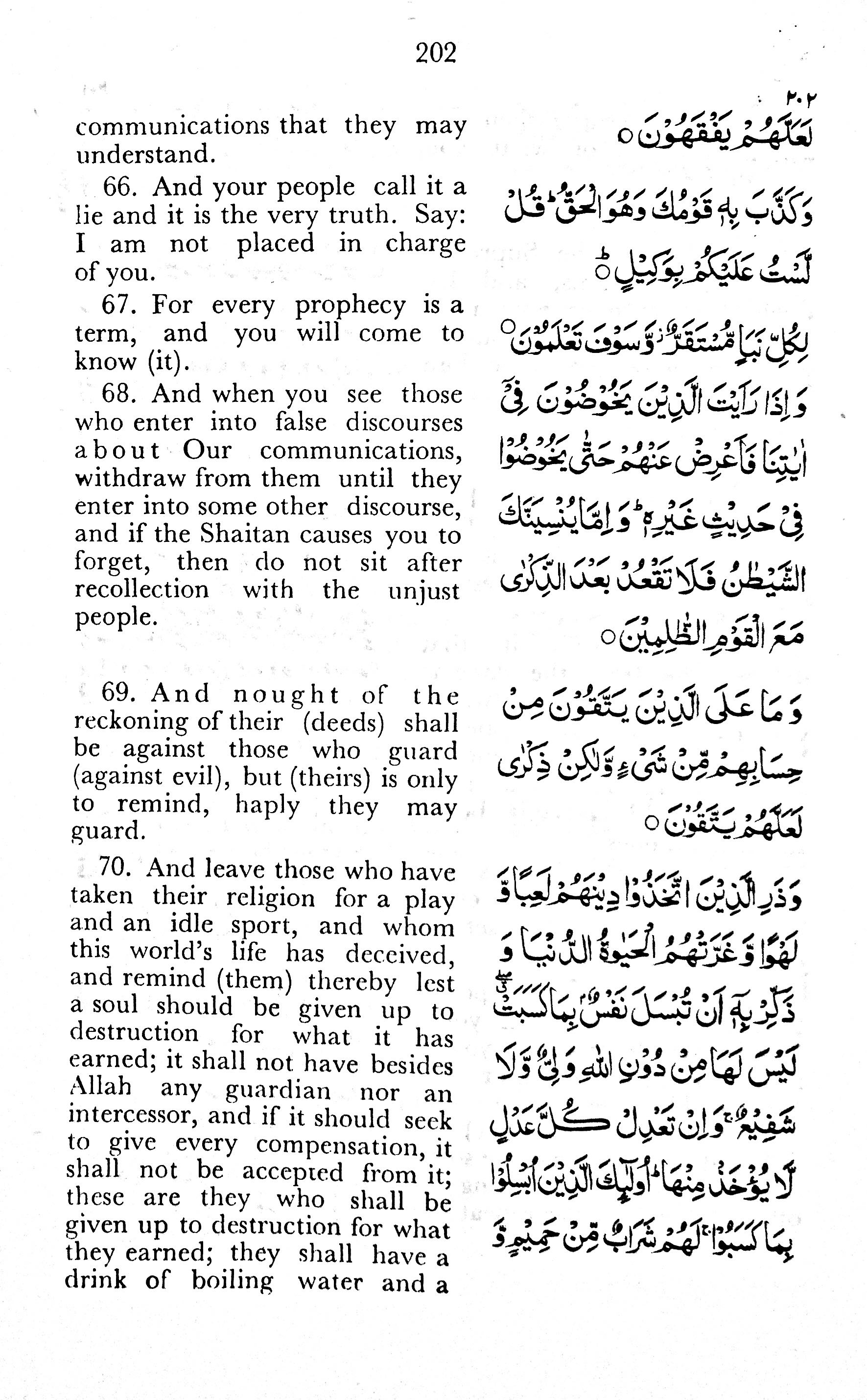 70. And leave those who have taken their religion for a play and an idle sport, and whom this world’s life has deceived, and remind (them) thereby lest a soul should be given up to destruction for what it has earned; it shall not have besides Allah any guardian nor an intercessor, and if it should seek to give every compensation, it shall not be accepted from it; these are they who shall be given up to destruction for what they earned; they shall have a drink of boiling water and a