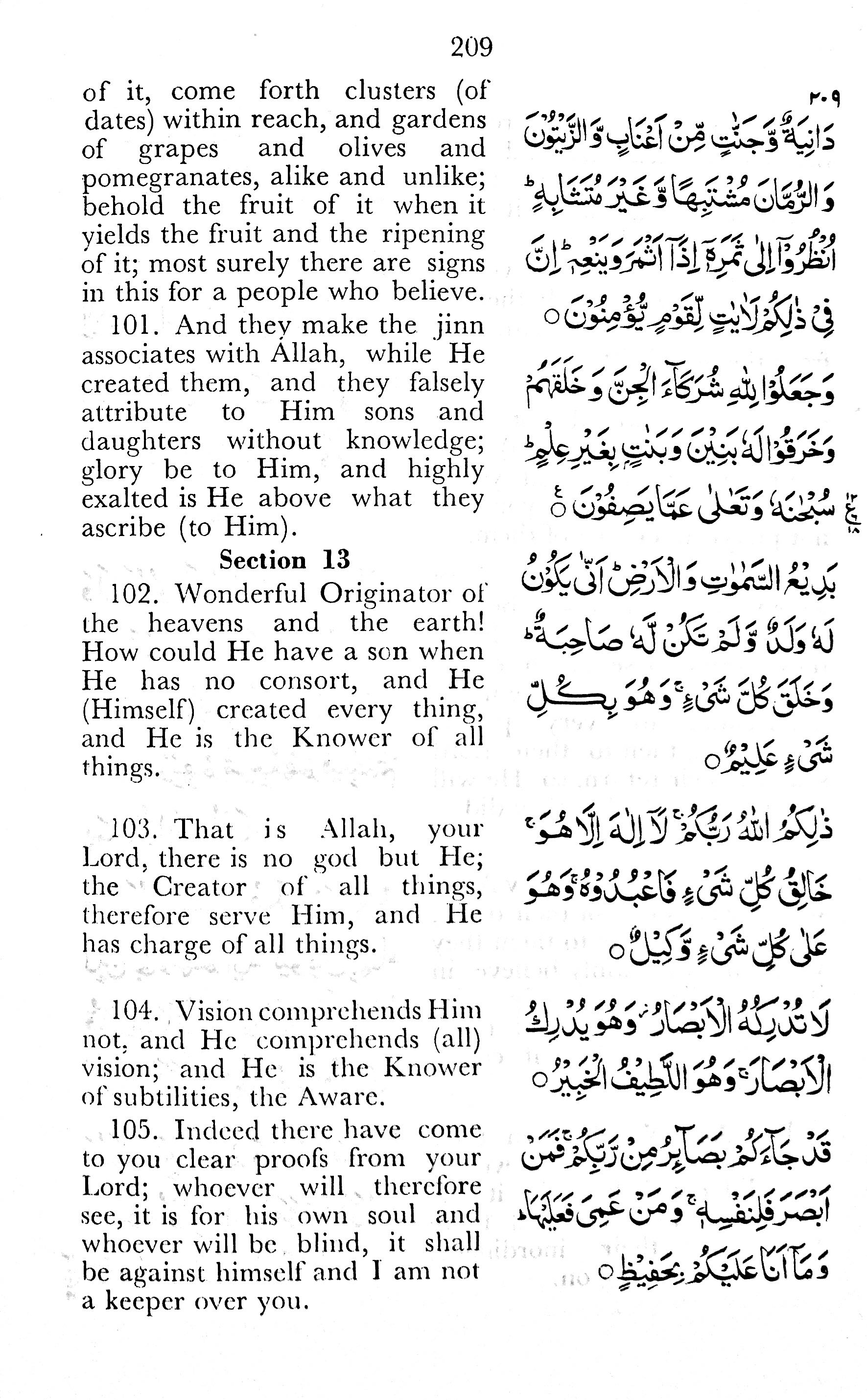102. Wonderful Originator of the heavens and the earth! How could He have a son when He has no consort, and He (Himself) created every thing, and He is the Knower of all things.