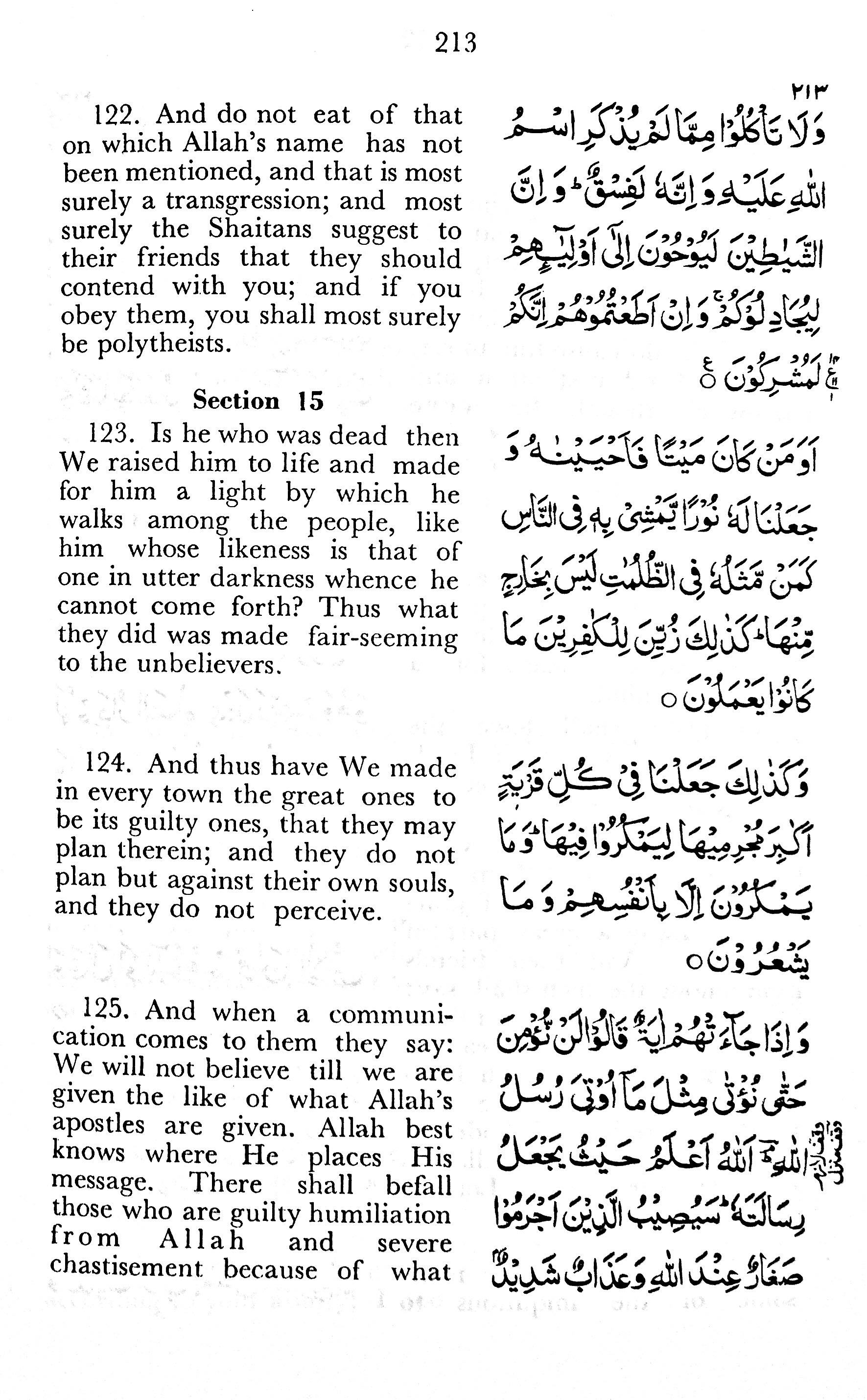 122. And do not eat of that on which Allah’s name has not been mentioned, and that is most surely a transgression; and most surely the Shaitans suggest to their friends that they should contend with you; and if you obey them, you shall most surely be polytheists.
