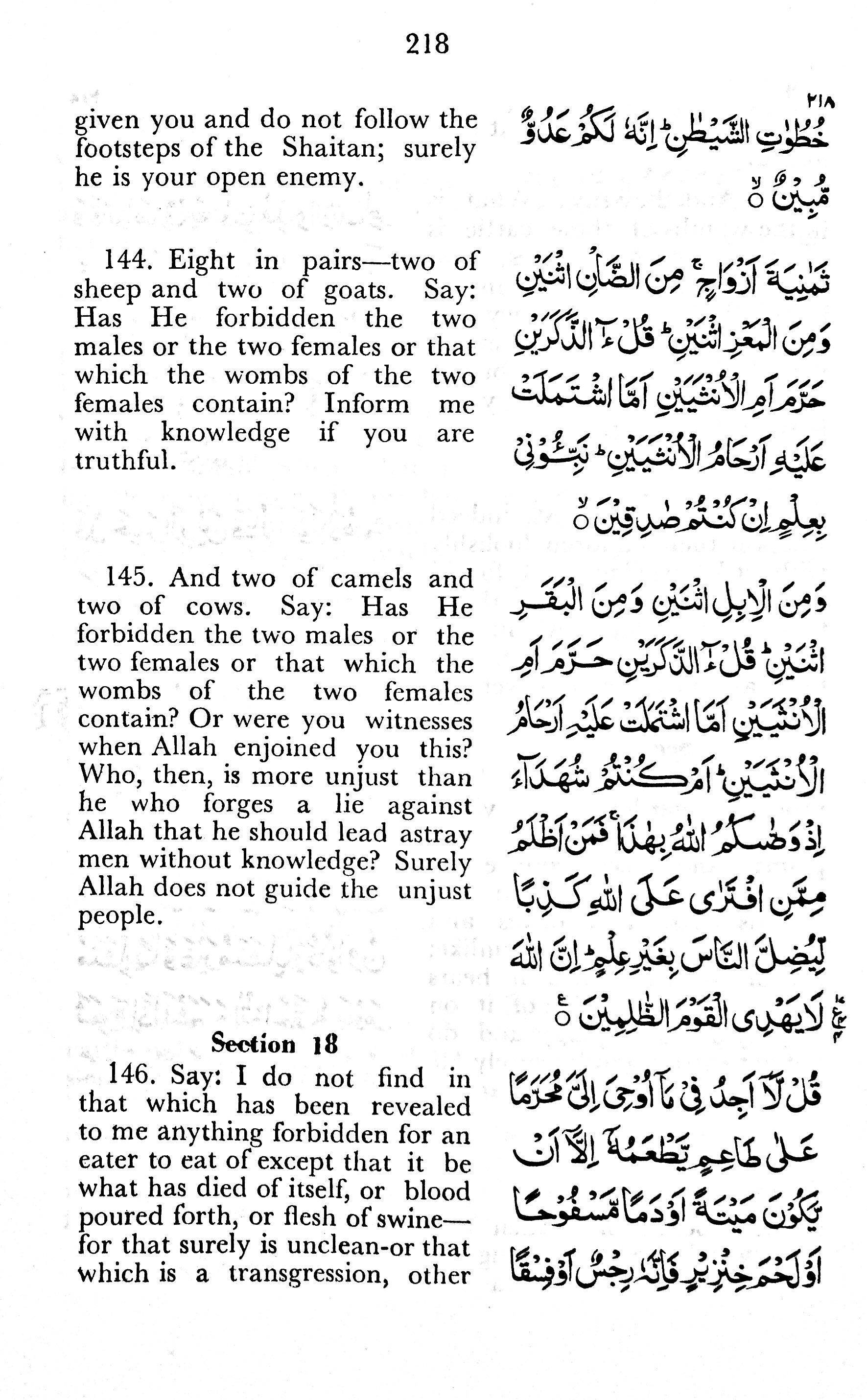 145. And two of camels and two of cows. Say: Has He forbidden the two males or the two females or that which the wombs of the two females contain? Or were you witnesses when Allah enjoined you this? Who, then, is more unjust than he who forges a lie against Allah that he should lead astray men without knowledge? Surely Allah does not guide the unjust people.