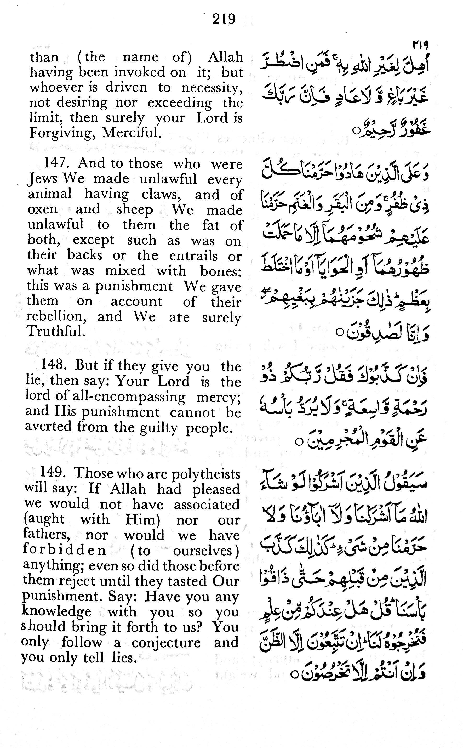 149. Those who are polytheists will say: If Allah had pleased we would not have associated (aught with Him) nor our fathers, nor would we have forbidden (to ourselves) anything; even so did those before them reject until they tasted Our punishment. Say: Have you any knowledge with you so you should bring it forth to us? You only follow a conjecture and you only tell lies.