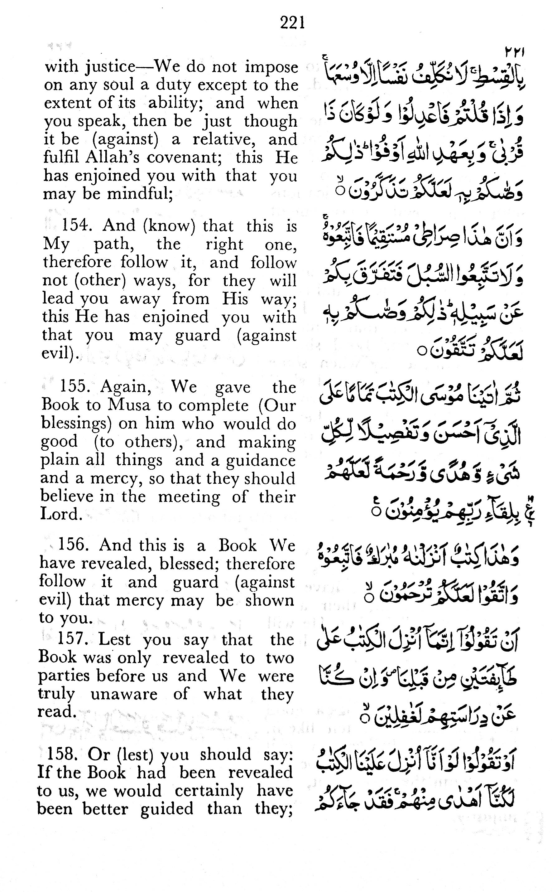 154. And (know) that this is My path, the right one, therefore follow it, and follow not (other) ways, for they will lead you away from His way; this He has enjoined you with that you may guard (against evil).