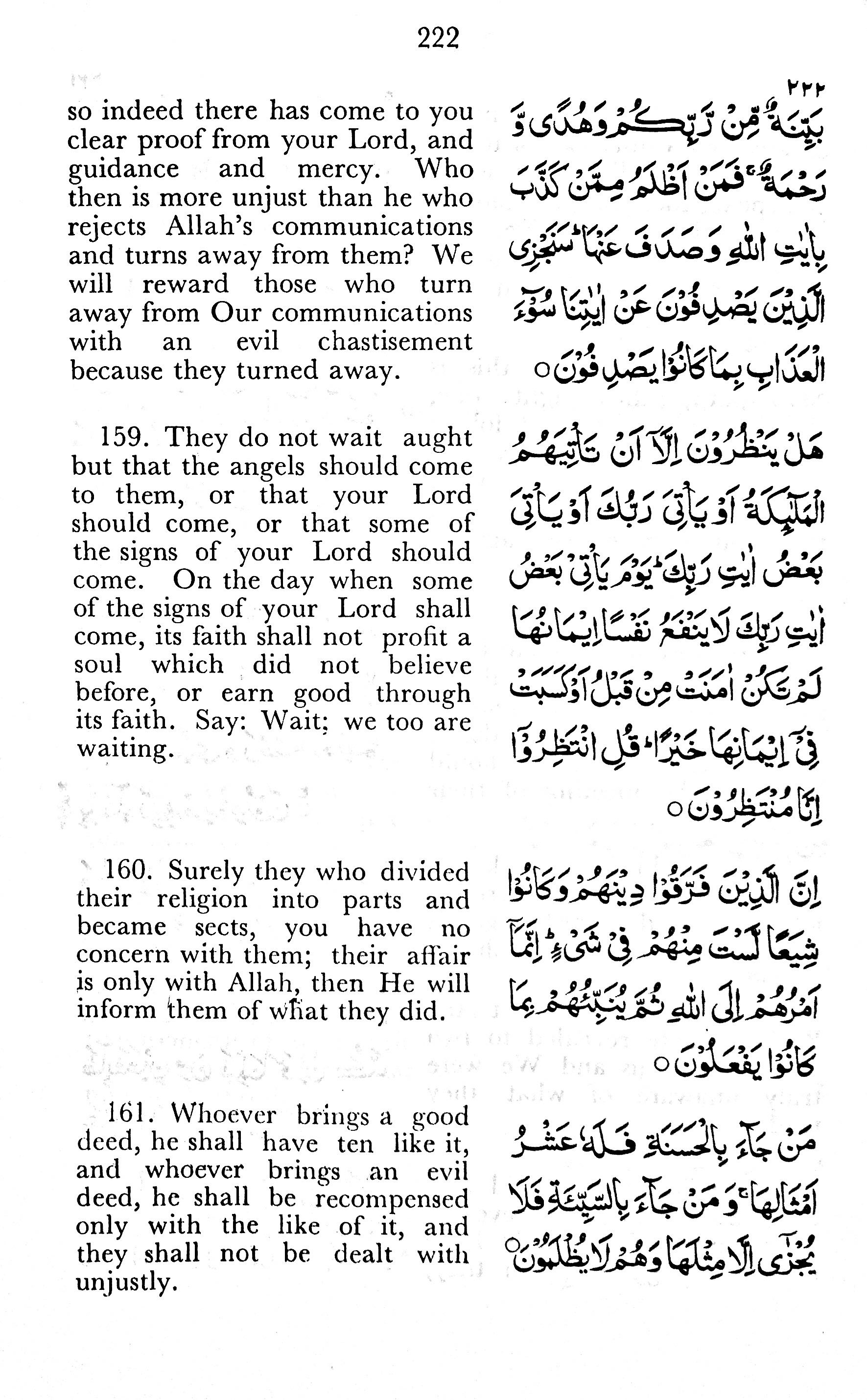 161. Whoever brings a good deed, he shall have ten like it, and whoever brings an evil deed, he shall be recompensed only with the like of it, and they shall not be dealt with unjustly.