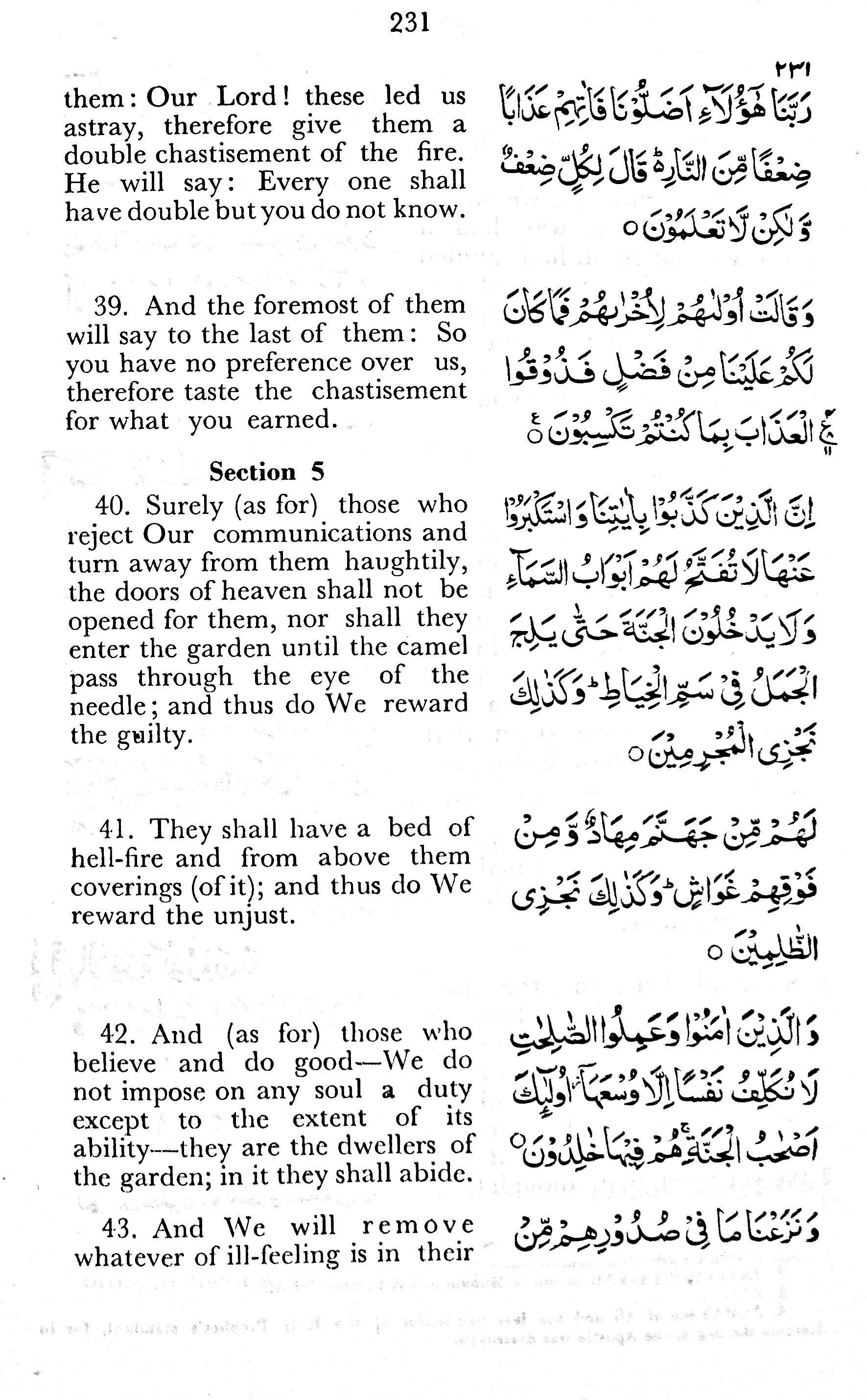 40. Surely (as for) those who reject Our communications and turn away from them haughtily, the doors of heaven shall not be opened for them, nor shall they enter the garden until the camel pass through the eye of the needle; and thus do We reward the guilty.
