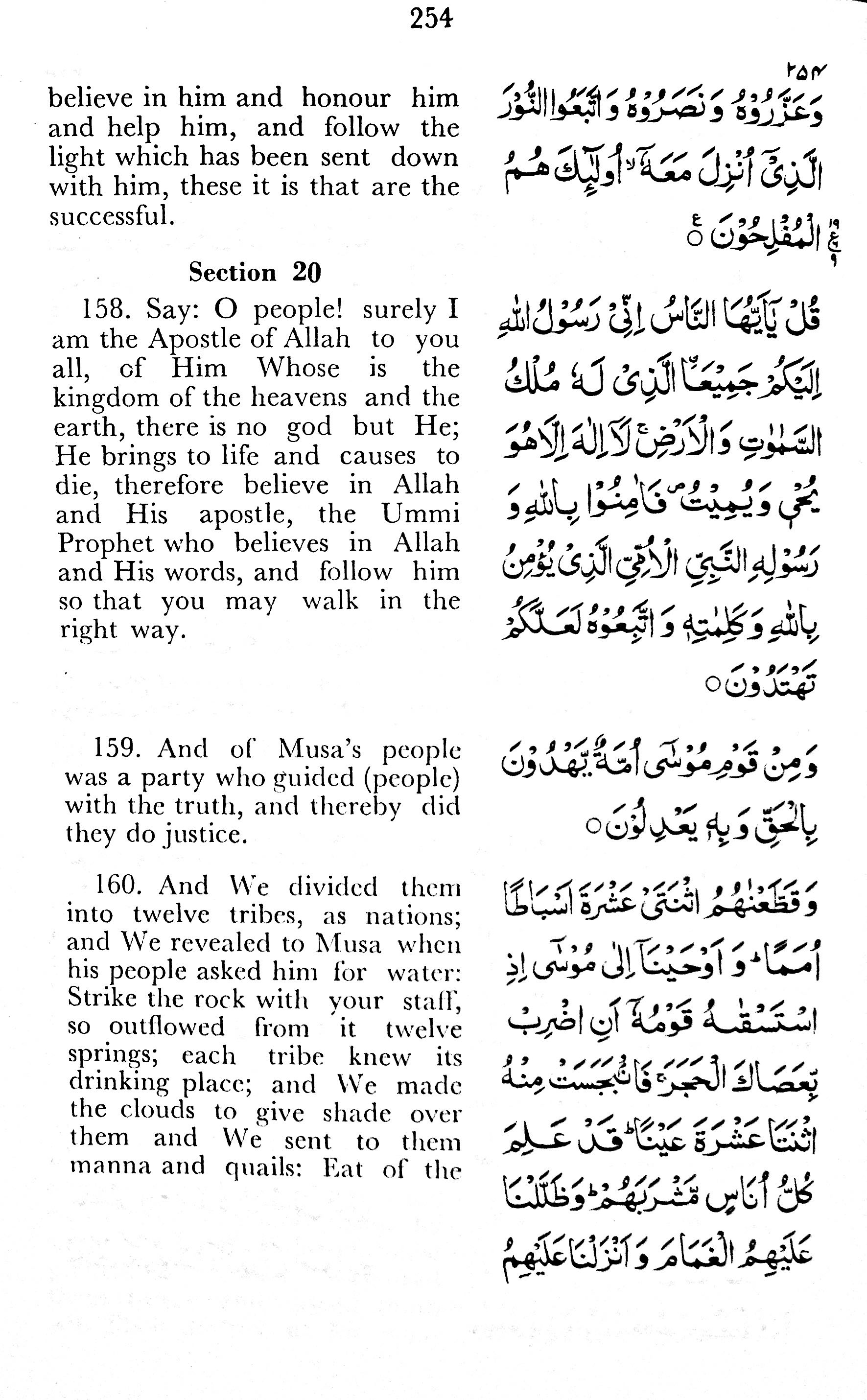 158. Say: O people! surely I am the Apostle of Allah to you all, of Him Whose is the kingdom of the heavens and the earth, there is no god but He; He brings to life and causes to die, therefore believe in Allah and His apostle, the Ummi Prophet who believes in Allah and His words, and follow him so that you may walk in the right way.