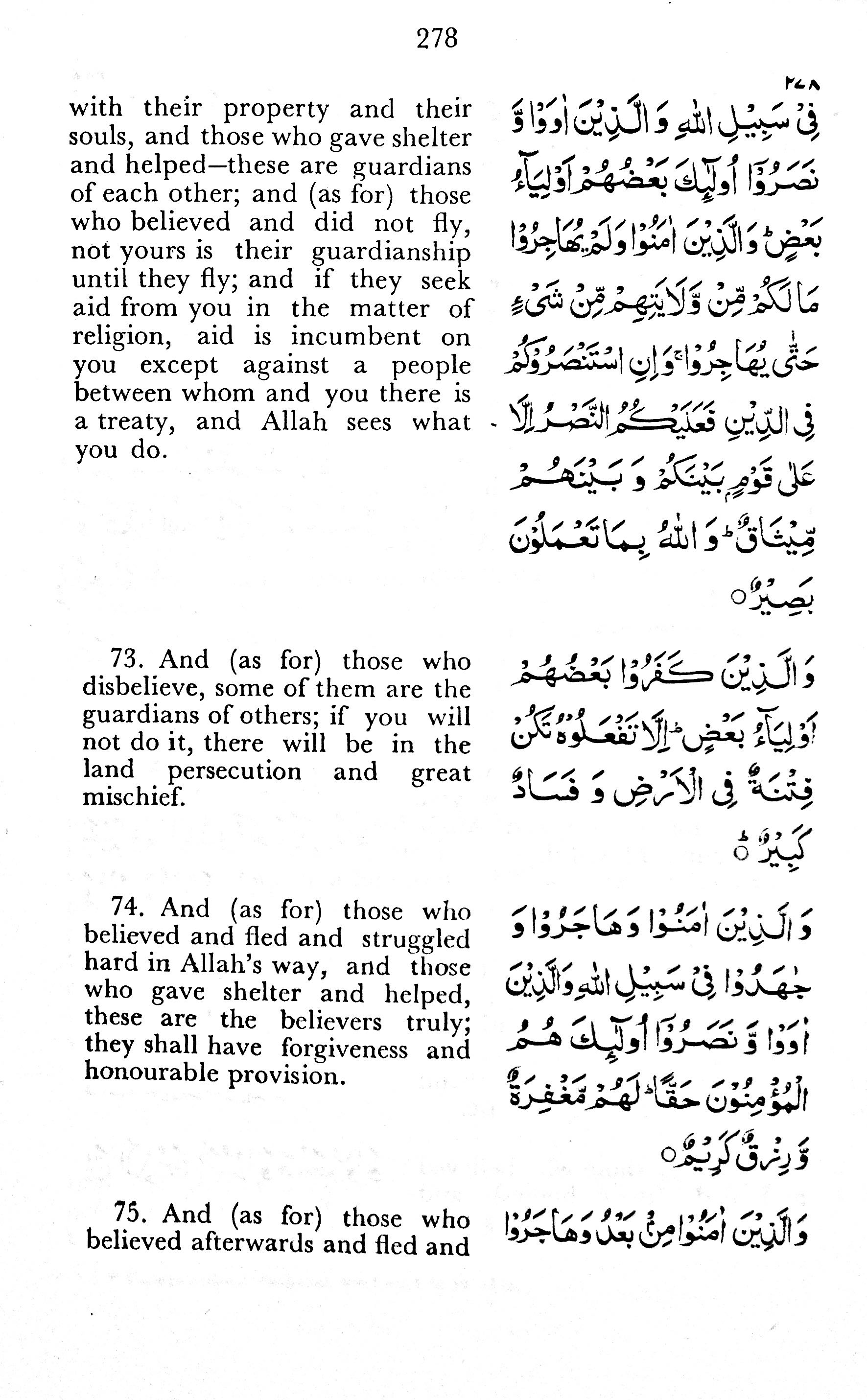 with their property and their souls, and those who gave shelter and helped—these are guardians of each other; and (as for) those who believed and did not fly, not yours is their guardianship until they fly; and if they seek aid from you in the matter of religion, aid is incumbent on you except against a people between whom and you there is a treaty, and Allah sees what you do.