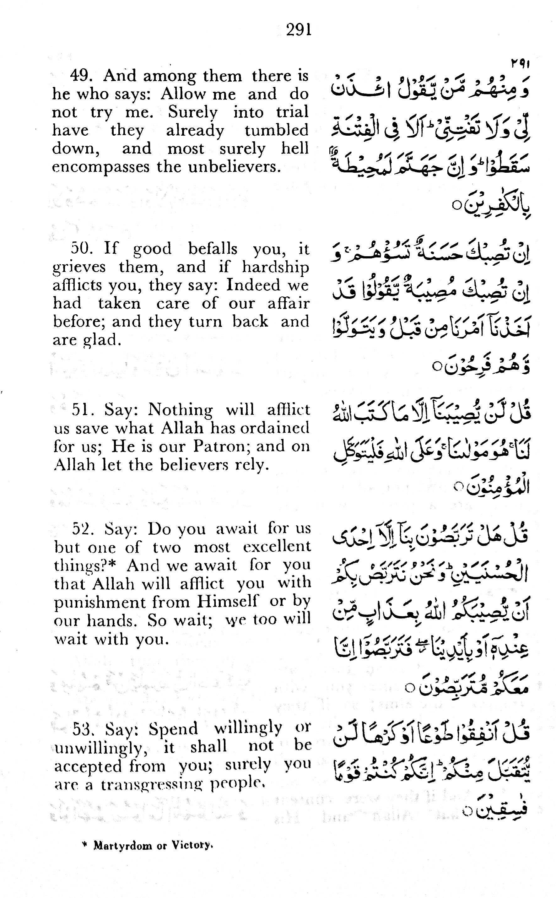 49. And among them there is he who says: Allow me and do not try me. Surely into trial have they already tumbled down, and most surely hell encompasses the unbelievers.
