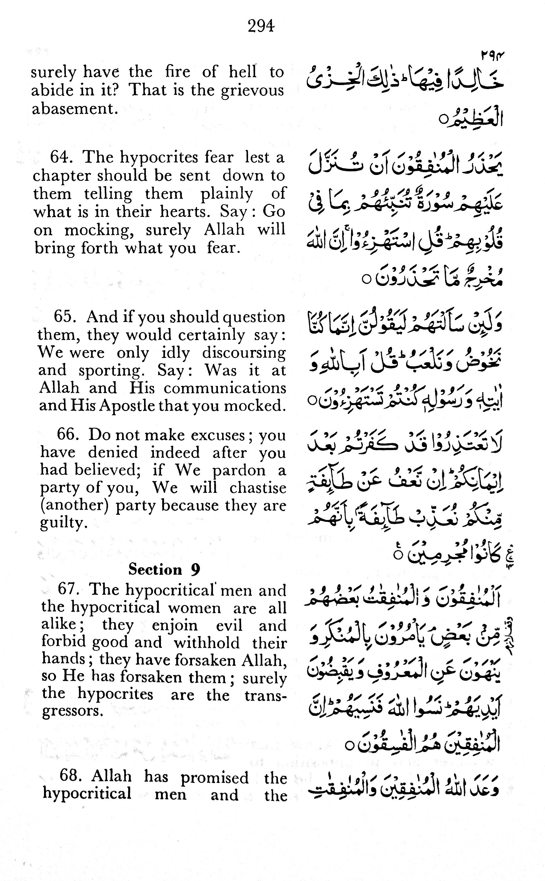 67. The hypocritical men and the hypocritical women are all alike; they enjoin evil and forbid good and withhold their hands; they have forsaken Allah, so He has forsaken them; surely the hypocrites are the transgressors.