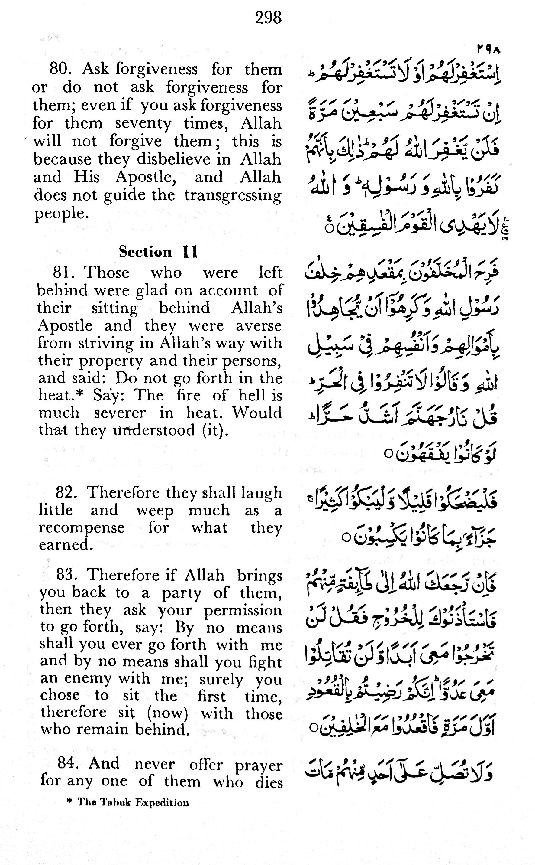80. Ask forgiveness for them or do not ask forgiveness for them; even if you ask forgiveness for them seventy times, Allah will not forgive them; this is because they disbelieve in Allah and His Apostle, and Allah does not guide the transgressing people.