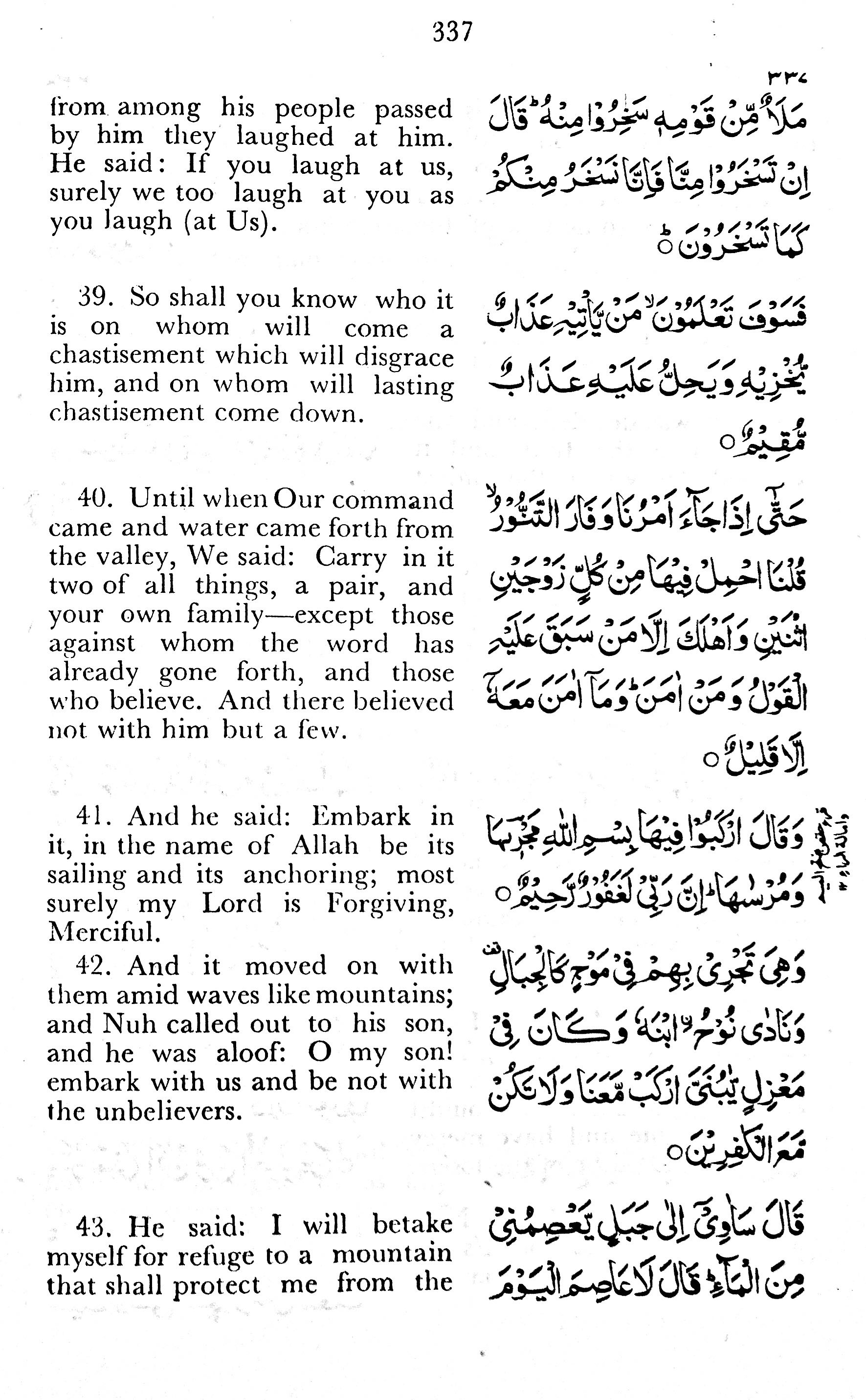 42. And it moved on with them amid waves like mountains; and Nuh called out to his son, and he was aloof: O my son! embark with us and be not with the unbelievers.
