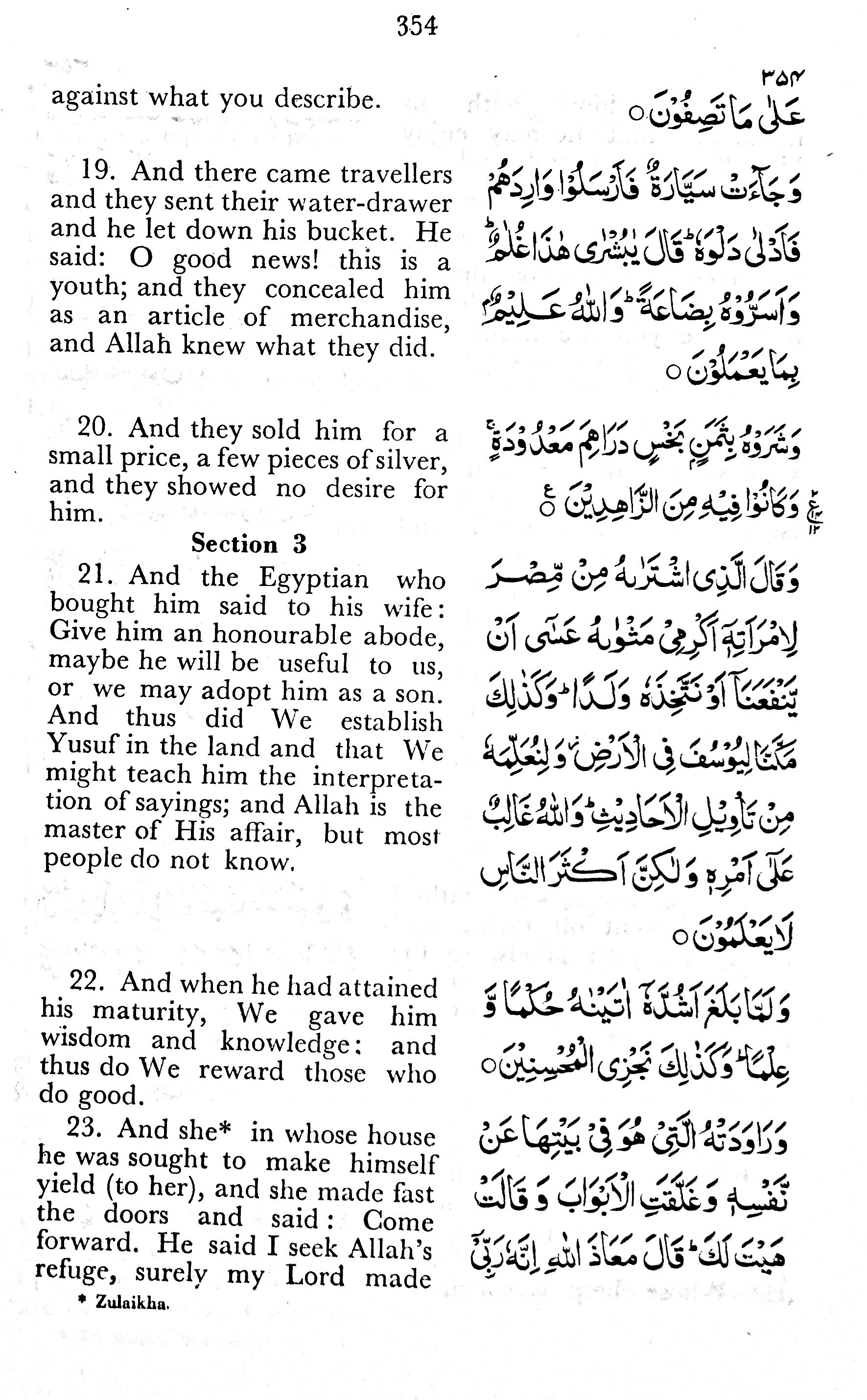 23. And she* in whose house he was sought to make himself yield (to her), and she made fast the doors and said: Come forward. He said I seek Allah’s refuge, surely my Lord made